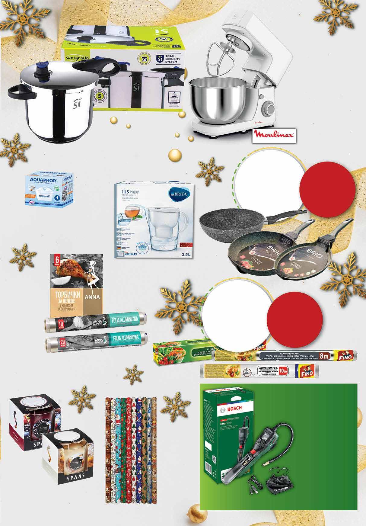118 99 лв|бр 99 лв|бр 199.99 -50% 99 199 99 лв|бр 299.99 -33% 12.99 -23% 9 99 лв|бр 3.29 -25% 2 45 лв|бр 99 лв|бр 49.99 -28% 35 3.49 -20% 2 79 лв|бр ал. фолио 10 m 5.99 -20% 4 79 лв|бр ал. фолио 20 m 1.99 -20% 1 59 лв|бр торбички 14.99 -50% 7 49 лв|бр Акумулаторна помпа BOSCH Easy Pump въздушна • Помпане до 10,3 bar с измерване в реално време и функция автоматично спиране; • Идеална за помпане на гуми (на автомобил, мотоциклет, велосипед), топки; • Вградена акумулаторна батерия и USB-C® зареждане, ярко осветена чрез светодиодна светлина. Тенджера под налягане 5.5 л SAN IGNACIO DUERO • висококачествена неръждаема стомана; • за всички видове котлони; • диаметър 22см Миксер робот MOULINEX QA150110, 800W двойно планетарно въртене за бързи и оптимални резултати 6 скорости + Pulse режим 3 аксесоара: телена бъркалка за леки смеси, приставки за месене на тесто и разбъркване купа с вместимост 4,8 л Свещ SPAAS различни аромати ± 30 часа горене 1 бр Опаковъчна хартия новогодишна 70/200 см различни дизайни Кана BRITA Marella XL с календар 3.5 л Алуминиево фолио 10 м; Алуминиево фолио 20 м; Торбички за печене 6 бр ANNA ZARADNA Филтър AQUAPHOR Maxfor Plus; Maxfor Plus Mg; Maxfor Plus H 1 бр *предложението е валидно за магазините със сини цени Индукционни тигани с марка BRIO STONE с ОТСТЪПКА -45% *предложението е валидно за магазините със сини цени Вчички опаковъчни и алуминиеви фолиа с марка FINO с ОТСТЪПКА -20% 27 ТВ „Фантастико” не носи отговорност за допуснати печатни грешки. Количествата са лимитирани! Предложенията са валидни до сряда 22.00ч. на 04.01.2023 г.