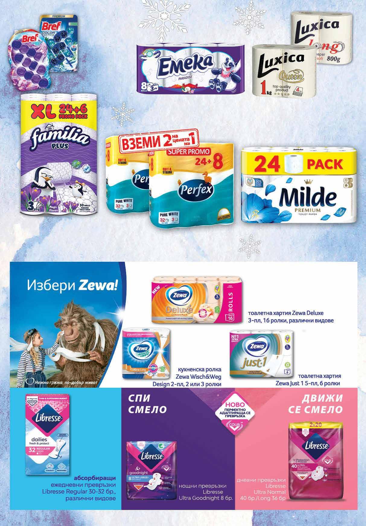 2 99 лв|оп. 2 99 лв|оп. 6 99 лв|оп. 99 лв|бр 19 9.99 -30% 6 99 лв|бр 15.29 -34% 9 99 лв|бр 10.95 -22% 8 49 лв|бр 1 кг 8.99 -22% 6 99 лв|бр 800 г 98 лв|2 oп. 43.96 -50% 21 5 69 лв|бр 99 лв|oп. 13 6 69 лв|k-t 99 лв|бр 25.99 -30% 17 Тоалетна хартия PERFEX трипластова Pure White 2* оп. х 24+8 бр ; лавандула 2* оп. 32 бр *от един и същи вид Тоалетна хартия FAMILIA Magic Flowers; White трипластова 24+6 бр пакет Тоалетна хартия LUXICA четирипластова 1 кг; трипластова 800 г 4 бр бяла Тоалетна хартия EMEKA трипластова, 8 бр, различни видове Комплект ароматизатор за WC BREF Color Aktiv; Switch Perfume; Deluxе; 3 бр х 50 г Brilliant 3 бр х 42 г различни видове Тоалетна хартия MILDE Premium различни видове трипластова, ароматизирана 24 бр в оп. 31 ТВ „Фантастико” не носи отговорност за допуснати печатни грешки. Количествата са лимитирани! Предложенията са валидни до сряда 22.00ч. на 04.01.2023 г.