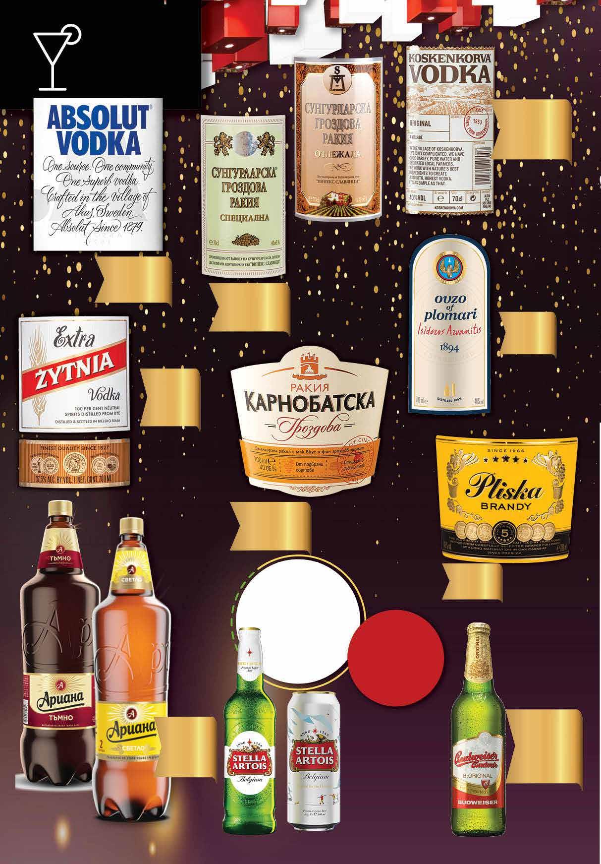 12.99 -25% 9 69 лв|бр 2.79 -28% 1 99 лв|бр 3.29 -30% 2 29 лв|бр тъмно 99 лв|бр 14.99 -20% 11 69 лв|бр 20.99 -25% 15 99 лв|бр 22.99 -26% 16 99 лв|бр отлежала 18.99 -26% 13 12.99 -30% 8 99 лв|бр 2.69 -26% 1 99 лв|бр 99 лв|бр специална 22.99 -21% 17 49 лв|бр 21.99 -29% 15 Гроздова ракия СУНГУРЛАРСКА Специална; Отлежала 700 мл Водка KOSKENKORVA Original произход Финландия 700 мл Водка ABSOLUT син етикет 700 мл Ракия КАРНОБАТСКА ГРОЗДОВА 700 мл Бренди PLISKA 700 мл Бира АРИАНА светло; тъмно PET, 2 л Узо PLOMARI 700 мл Водка ZYTNIA Extra 700 мл Бира BUDWEISER бутилка, 500 мл *с включен амбалаж 0,20лв Всички бири с марка STELLA ARTOIS с ОТСТЪПКА МИНИМУМ -27% 18 Продуктите се продават в количества, обичайни за едно домакинство. Декорацията към продуктите не е включена в тяхната цена. ТВ „Фантастико“ си запазва правото на промяна в цените.