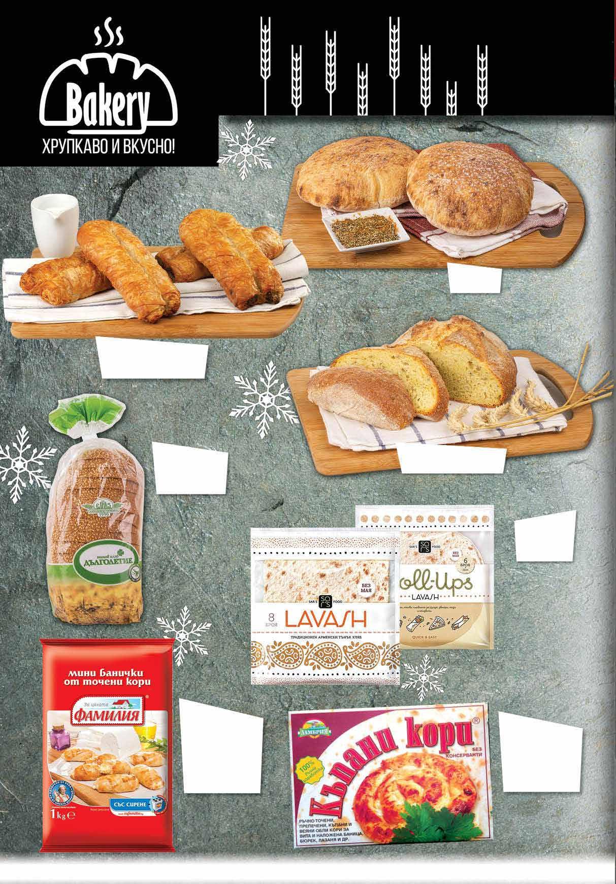2.89 -31% 1 99 лв|бр 6 бр 3.15 -36% 1 99 лв|бр 8 бр 1.69 -47% 0 89 лв|бр 0.89 -22% 0 69 лв|бр 2.45 -26% 1 79 лв|бр 2.19 -27% 1 59 лв|бр 6.39 -21% 4 99 лв|бр 11.79 -32% 7 99 лв|бр Баничка със сирене; със сирене и спанак 120 г Пърленка 160 г Типов хляб Дълголетие ЕЛИАЗ 450 г Пшеничено-царевичен хляб 400 г Хляб ЛАВАШ 6 бр, 240 г; 8 бр, 320 г Мини банички ФАМИЛИЯ различни видове 1 кг Kъпани кори МАГИМЕКС 5 бр в опаковка замразени 700 г 12 Продуктите се продават в количества, обичайни за едно домакинство. Декорацията към продуктите не е включена в тяхната цена. ТВ „Фантастико“ си запазва правото на промяна в цените.