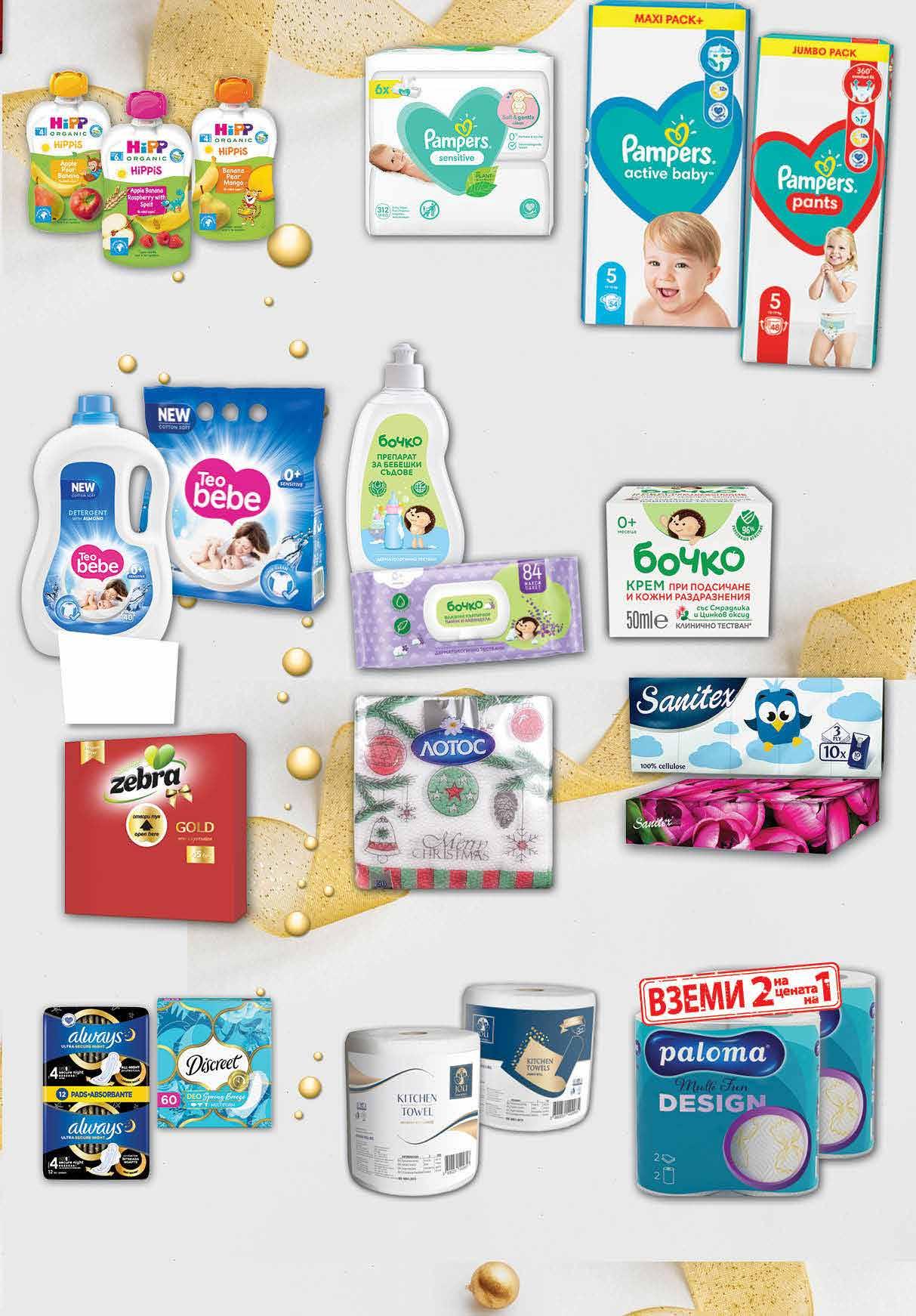 2 49 лв|бр 2 49 лв|бр 3.45 -27% 2 49 лв|бр 7.29 -31% 4 99 лв|бр ALWAYS 6.75 -26% 4 99 лв|бр discreet 99 лв|оп. 27 99 лв|пакет 11 2 79 лв|оп. 1 49 лв|бр 1 99 лв|бр 6.99 -30% 4 89 лв|бр basic 4.49 -33% 2 99 лв|бр jumbo 8.48 -50% 4 24 лв|2 оп. 8 99 лв|бр 99 лв|бр ГЕЛ 2,2 Л 13 Кърпи бебешки с капак различни видове 84 бр в опаковка; Препарат за бебешки съдове 500 мл БОЧКО Комплект бебешки кърпички PAMPERS Fresh; Sensitive 6 оп. х 52 бр в пакет Био плодова закуска HIPP различни видове 100 г Крем при подсичане и кожни раздразнения БОЧКО 50 мл Дамски превръзки ALWAYS Duo Pack 10, 12, 14, 16, 18, 20 бр DISCREET ежедневни 54, 60 бр различни видове Бебешки пелени PAMPERS Maxi Pack 44, 48, 54, 58, 62, 70, 76 бр, различни размери; Бебешки гащички PAMPERS Jumbo Pack 38, 44, 48, 52, 60 бр различни размери Салфетки ZEBRA 33х33 см 45 бр в опаковка Коледни салфетки ЛОТОС 33х33 см 50 бр в опаковка Кърпи за лице двупластови 100 бр в кутия Носни кърпи трипластови 10х10 бр в пакет SANITEX различни видове Кухненско руло JOLI Jumbo; Bаsic 1 бр Кухненско руло PALOMA Multi Fun 2 оп. х 2 бр в опаковка Прах 1,5 кг; Гел 1,1 л; Гел 2,2 л различни видове за пране ТЕО БЕБЕ 29 ТВ „Фантастико” не носи отговорност за допуснати печатни грешки. Количествата са лимитирани! Предложенията са валидни до сряда 22.00ч. на 04.01.2023 г.