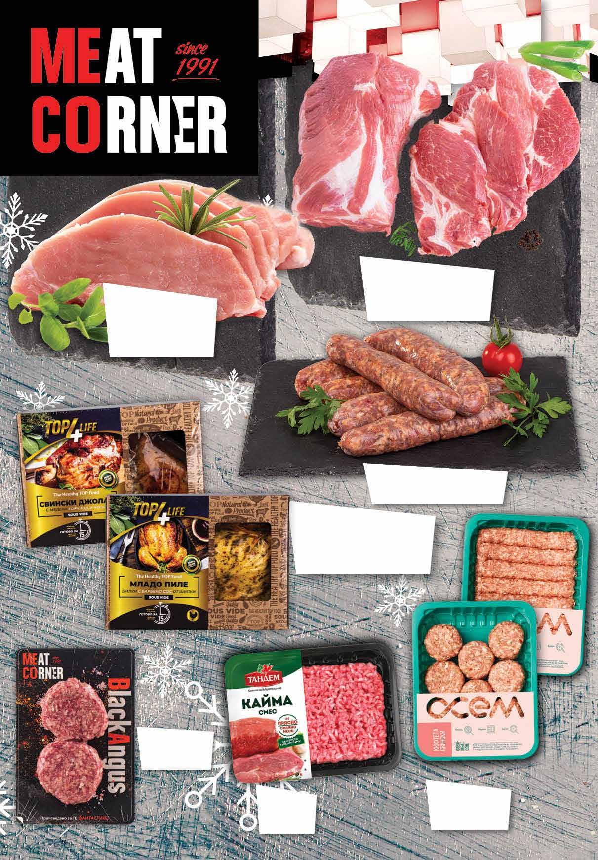 9.99 -25% 7 49 лв|бр 8.39 -28% 5 99 лв|бр 6.69 -28% 4 79 лв|бр 11.89 -24% 8 99 лв|кг 9 99 лв|кг 9 99 лв|кг 14.99 -33% 9 99 лв|бр джолан 14.99 -40% 8 99 лв|бр пиле Кайма смес ТАНДЕМ охладена 500 г Суров суджук Петрохан насипен от щандова витрина БИЛЯНА-МЕС Кюфтета/ кебапчета свински ОСЕМ тарелка, 480 г Говежди бургер MEAT CORNER Black Angus 300 г *Цената не важи за предварително опаковано месо Свински врат без кост охладен, насипен от щандова витрина* Свински джoлан с горчица и чесън 700 г; Младо пиле с билки и барбекю сос от шипки 880 г TOP4LIFE охладено Свинско контрафиле охладено, насипно от щандова витрина* *Цената не важи за предварително опаковано месо 6 Продуктите се продават в количества, обичайни за едно домакинство. Декорацията към продуктите не е включена в тяхната цена. ТВ „Фантастико“ си запазва правото на промяна в цените.