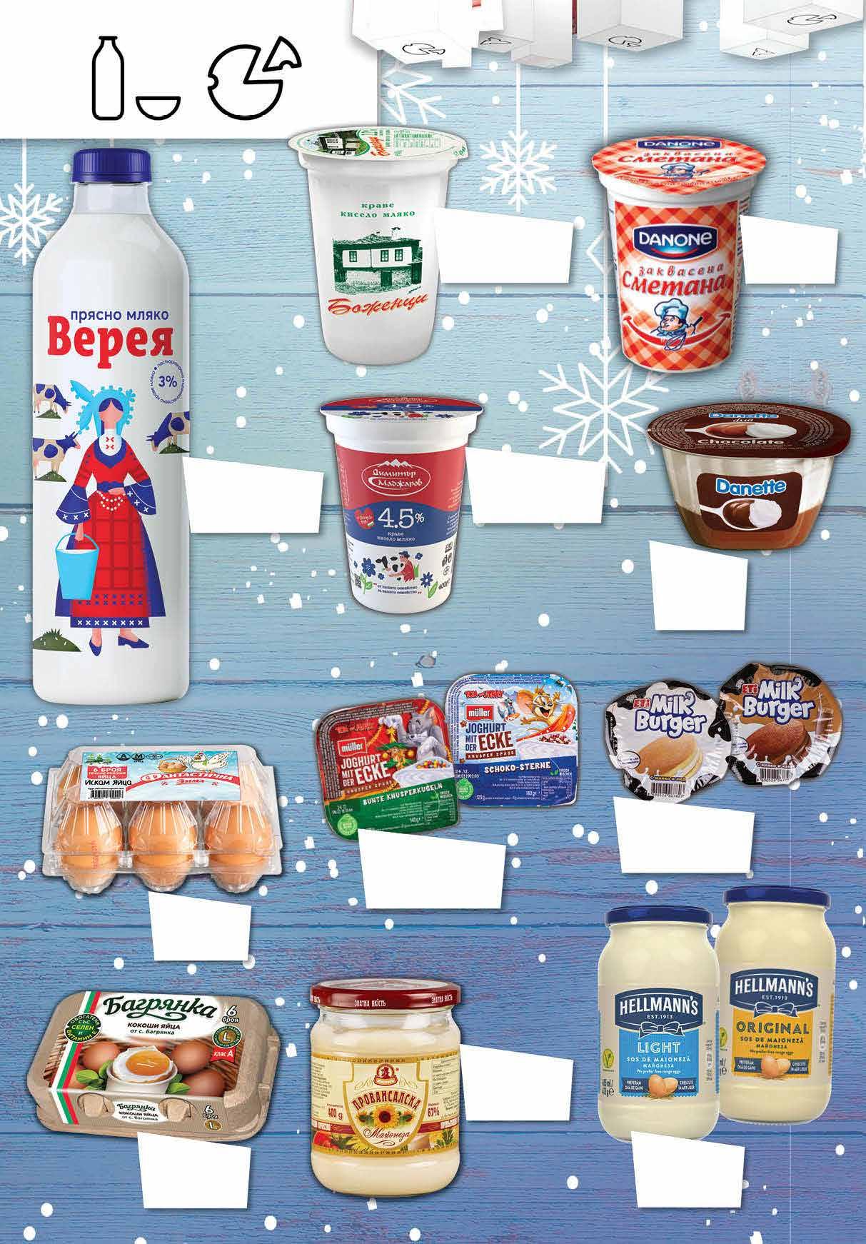 4.79 -18% 3 89 лв|бр 7.89 -39% 4 79 лв|бр 3.29 -21% 2 59 лв|бр 1.69 -23% 1 29 лв|бр 4.09 -22% 3 19 лв|бр 3.35 -20% 2 65 лв|бр 1.75 -20% 1 39 лв|бр 1.09 -31% 0 75 лв|бр 1.79 -24% 1 35 лв|бр 1.95 -28% 1 39 лв|бр 4.79 -22% 3 69 лв|бр Прясно мляко ВЕРЕЯ масленост 3% 1 л Заквасена сметана DANONE 380 г Майонеза HELLMANN`S Light; Original 405 мл DANETTE DUO различни видове 115 г Кекс ETI MILK BURGER различни видове 35 г Десерт MULLER Tom And Jerry различни видове 140 г Кисело мляко БОЖЕНЦИ масленост 2,2% 400 г Яйца със селен БАГРЯНКА размер L 6 бр кутия Яйца ИСКАМ ЯЙЦА размер М 6 бр кутия Кисело мляко МАДЖАРОВ масленост 4,5% 400 г Майонеза ЖИРНОВЪ Провансалска буркан, 400 г 2 Продуктите се продават в количества, обичайни за едно домакинство. Декорацията към продуктите не е включена в тяхната цена. ТВ „Фантастико“ си запазва правото на промяна в цените.