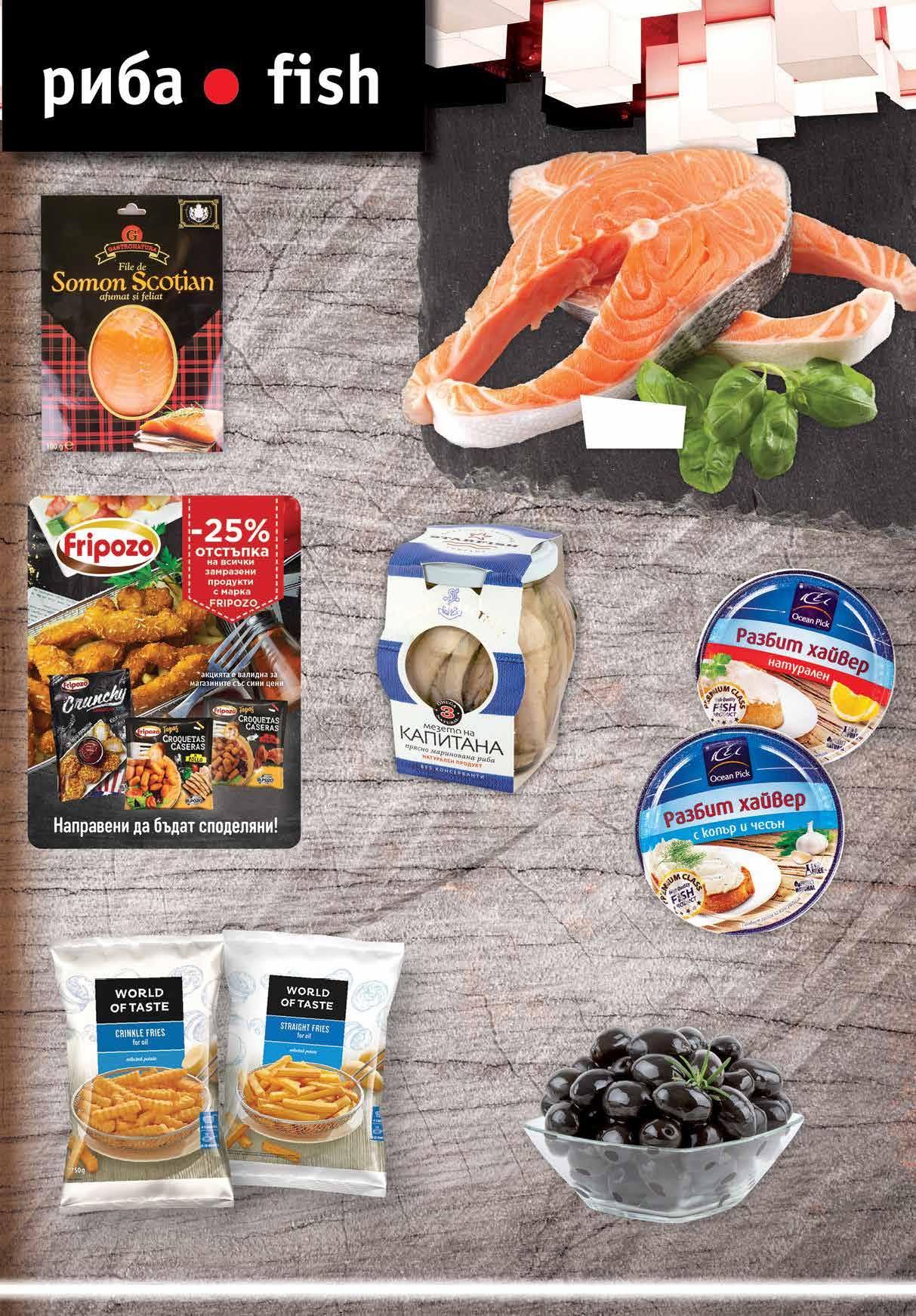 7.49 -33% 4 99 лв|бр 3.29 -30% 2 29 лв|бр 6.99 -28% 4 99 лв|бр 12.99 -30% 8 99 лв|кг 5.49 -30% 3 79 лв|бр къдрави 4.99 -30% 3 49 лв|бр 89 лв|кг 39.99 -25% 29 Замразени картофи WORLD OF TASTE различни видове 750 г - 1 кг Пушена шотландска сьомга GASTRONATURA слайс 100 г Мариновани рибни специалитети STARFISH различни видове 300 г Черни маслини супер супер мамут насипни от щандова витрина Разбит хайвер OCEAN PICK различни видове 160 г Сьомга котлет от щандова витрина* 7ТВ „Фантастико” не носи отговорност за допуснати печатни грешки. Количествата са лимитирани! Предложенията са валидни до сряда 22.00ч. на 26.10.2022 г. Продуктите се предлагат в следните филиали: Ф6 район Студентски, бул. Г.М. Димитров №77; Ф7 жк Овча купел 1, ул. Монтевидео №98; Ф11 жк Хаджи Димитър, ул. Васил Кънчев/ул. Баба Вида №29; Ф14 гр. Ботевград, ул. Витоша 1А; Ф16 жк Люлин 6, бул. Джавахарлал Неру №26А; Ф17 жк Надежда 3, бул. Хан Кубрат №26, до бл. 301; Ф18 жк Стрелбище, ул. Нишава №138; Ф19 кв Бояна, бул. Ал. Пушкин №64; Ф21 жк Младост 4, ул. Д-р Атанас Москов №15; Ф22 Студентски град, ул. Акад. Борис Стефанов №22; Ф28 жк Гео Милев, ул. Коста Лулчев №52, в сградата на Sky City Mall; Ф30 кв Драгалевци, бул. Черни връх №204; Ф34 жк Хаджи Димитър, ул. Макгахан №81; Ф36 жк Дървеница, бул. Св. Климент Охридски №15; Ф38 жк Овча купел, ул. Любляна №42А; Ф39 жк Разсадника – Коньовица, ул. Хъшове №4; Ф40 жк Гео Милев, ул. Николай Коперник №27; Ф41 гр. Елин Пелин, ул. Витоша №7; Ф42 жк Младост 1, бул. Йерусалим №22; Ф43 кв. Манастирски ливади, ул. Пирин №51А Ф44 гр. Банкя, кв. Изгрев, ул. Стефан Стамболов №138; Ф45 гр. Перник, ж.к. Изток, ул. Юрий Гагарин №52.