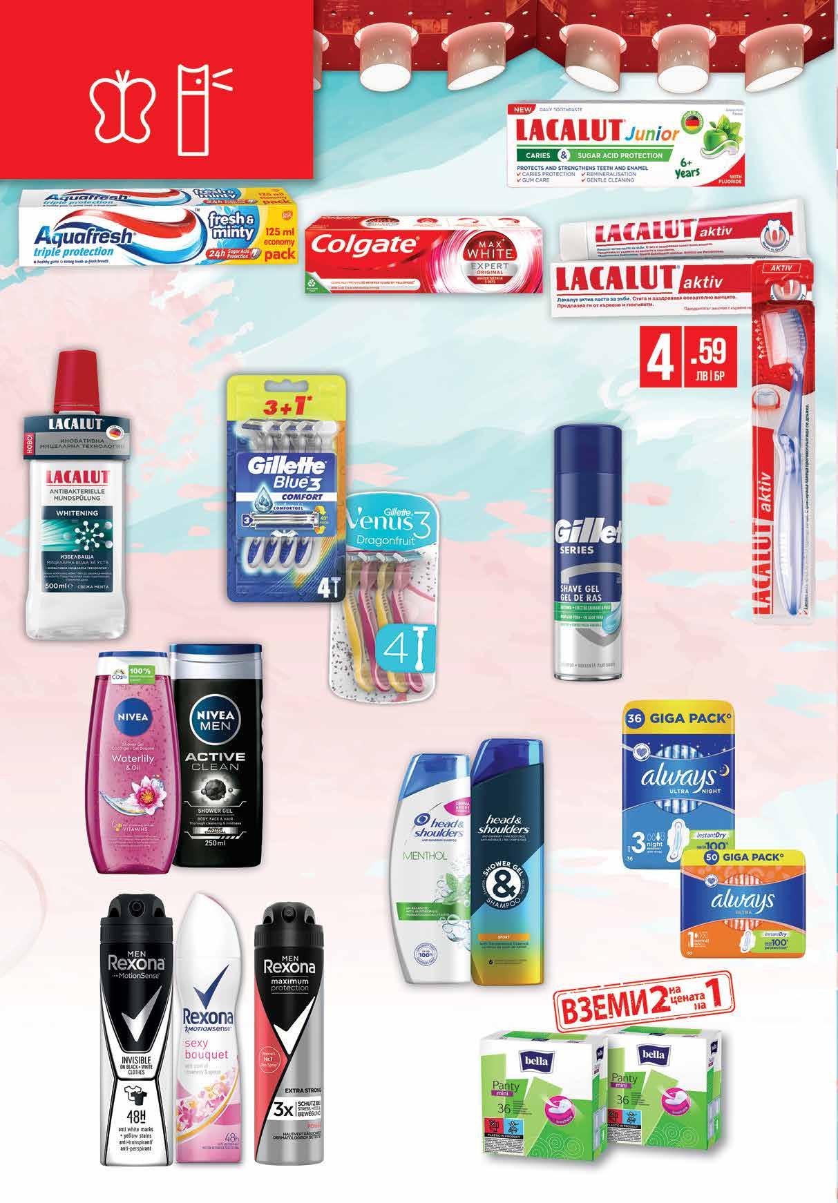 6.99 -38% 4 29 лв|бр 7.39 -50% 3 69 лв|бр 9.69 -43% 5 49 лв|бр 12.59 -44% 6 99 лв|бр 6 39 лв|бр 6 99 лв|бр 12.59 -44% 6 99 лв|бр душгел 9.99 -45% 5 49 лв|бр 4 59 лв|бр 4.19 -45% 2 29 лв|бр 4 59 лв|бр детска 6 99 лв|бр 6 49 лв|бр дамска 4.36 -50% 2 18 лв|2 оп 9 99 лв|бр night 9 99 лв|бр Део спрей 150 мл; Део рол-он 50 мл; Део стик 40-50 мл REXONA различни видове Паста за зъби COLGATE Max White Expert Micellar; Original; Active foam 75 мл Четка за зъби LACALUT различни видове Душ гел NIVEA различни видове 250 мл Вода за уста LACALUT различни видове 500 мл Шампоан Душгел 270; 300; 360 мл HEAD&SHOULDERS различни видове Самобръсначка GILLETTE Blue3 3+1 бр в пакет Venus 3 Dragonfruit 4 бр; Multicolor 4 бр; Simply 4+2 бр различни видове Гел за бръснене GILLETTE различни видове 200 мл Паста за зъби AQUAFRESH Active White; Fresh&Minty; Herbal; Active Fresh 125 мл Паста за зъби LACALUT различни видове 75 мл Паста за зъби LACALUT JUNIOR различни видове 55 мл Дамски превръзки BELLA PANTY 2 оп. х 36 бр в опаковка Дамски превръзки ALWAYS GIGA PACK ultra night 36 бр; ultra normal 50 бр Део спрей 150 мл maximum protection REXONA различни видове 20 Продуктите се продават в количества, обичайни за едно домакинство. Декорацията към продуктите не е включена в тяхната цена. ТВ „Фантастико“ си запазва правото на промяна в цените.