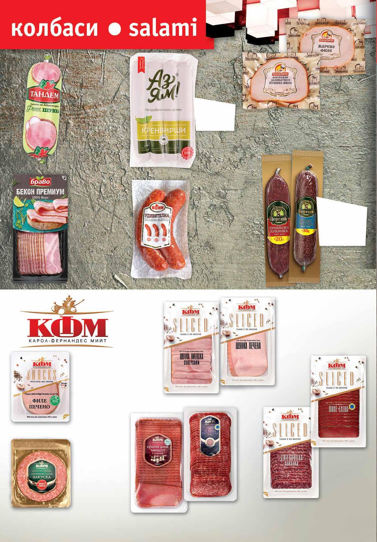 5.89 -23% 4 49 лв|бр 5.99 -25% 4 49 лв|бр жарено 5.69 -21% 4 49 лв|бр пуешко 6.49 -30% 4 49 лв|бр 6.99 -32% 4 69 лв|бр 69 лв|бр Филе с чубрица 14.99 -22% 11 49 лв|бр луканка 13.49 -22% 10 4.79 -22% 3 69 лв|бр 4.99 -22% 3 89 лв|бр 4.99 -24% 3 79 лв|бр виенска 4.99 -24% 3 79 лв|бр печена 3.99 -25% 2 99 лв|бр 5.69 -24% 4 29 лв|бр 5.99 -41% 3 49 лв|бр Луканка Троянска 180 + 20 г; Салам шпек Бургас 230 г +30 г ПЕРЕЛИК вакуум Кренвирши „Аз ям“ вакуум, 320 г ГРАДУС Луканков салам Закуска КФМ слайс вакуум, 160 г Луканка Панагюрска; Сушено филе с чубрица Чановете КФМ слайс, вакуум Печено филе КФМ слайс вакуум, 160 г Луканкова наденица Удивителна БОНИ вакуум, 330 г Формован деликатес с пуешко филе; Жарено свинско филе МАЙСТОР ЦВТКО вакуум, 250 г Луканка Смядовска 100 г; Филе Елена 80 г КФМ слайс, вакуум Шунка ТАНДЕМ Финес 300 г Печена/ Виенска шунка, слайс вакуум, 120 г Бекон БРАВО Премиум вакуум слайс,180 г 8 Продуктите се продават в количества, обичайни за едно домакинство. Декорацията към продуктите не е включена в тяхната цена. ТВ „Фантастико“ си запазва правото на промяна в цените.