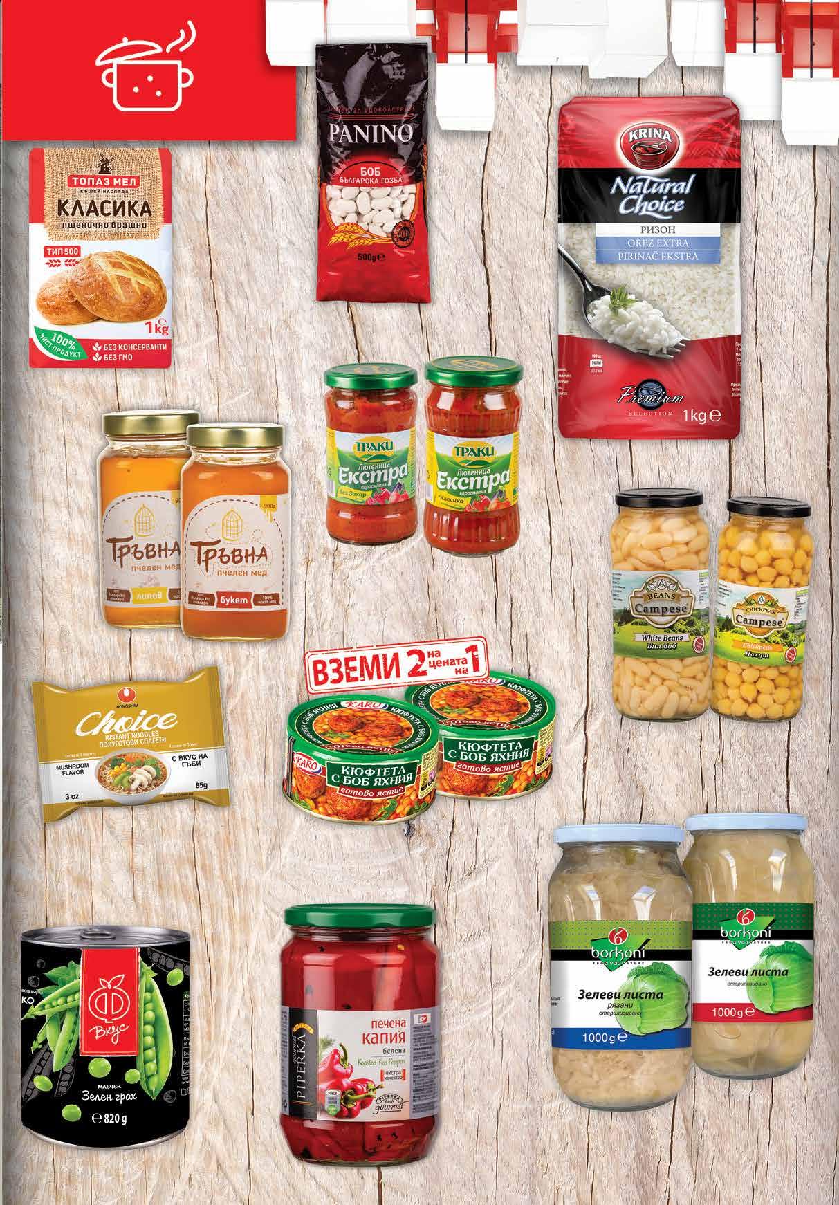 4.19 -23% 3 19 лв|бр 5.96 -50% 2 98 лв|2 бр 4.69 -27% 3 39 лв|бр 12.99 -23% 9 99 лв|бр БУКЕТ 13.49 -25% 9 99 лв|бр ЛИПОВ 2.89 -20% 2 29 лв|бр 3.39 -35% 2 19 лв|бр 1.99 -25% 1 49 лв|бр 3.99 -30% 2 79 лв|бр 2.99 -33% 1 99 лв|бр 3.69 -32% 2 49 лв|бр 1.65 -21% 1 29 лв|бр Ориз Ризон KRINA 1 кг Боб PANINO българска гозба 500 г Мед ТРЪВНА липов; букет 900 г *Пшенично брашно ТОПАЗ МЕЛ Класика тип 500, 1 кг *ограничение до 10 бр за клиент Печена капия PIPERKA белена 680 г Млечен зелен грах Ф ВКУС 820 г Бял боб; Нахут CAMPESE 540 г Спагети CHOICE полуготови различни вкусове 85 г Зелеви листа; Нарязано зеле BORKONI 1 кг Едросмляна лютеница ТРАКИ различни видове 300 г Кюфтета с боб яхния; Кюфтета фрикасе КАРО 2* бр х 300 г *от един и същи вид 9ТВ „Фантастико” не носи отговорност за допуснати печатни грешки. Количествата са лимитирани! Предложенията са валидни до сряда 22.00ч. на 26.10.2022 г.