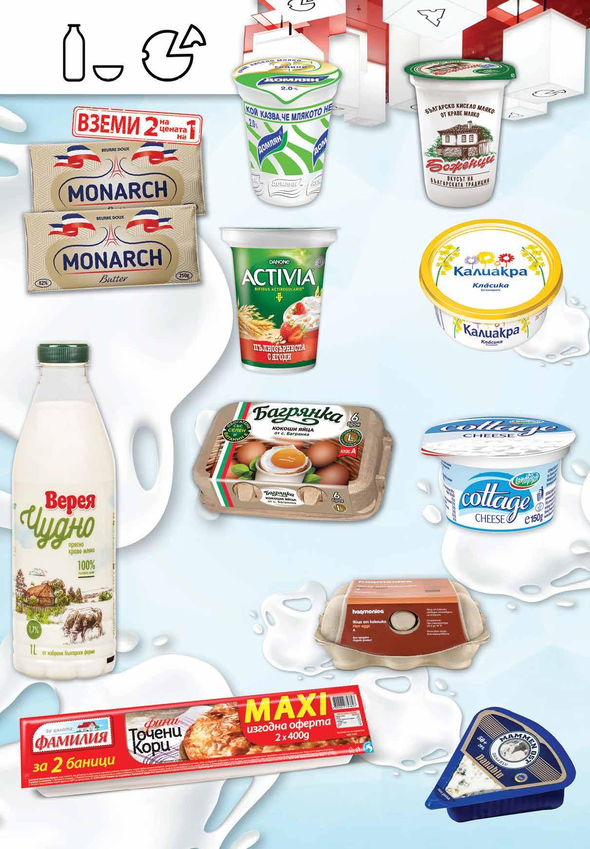 3.29 -24% 2 49 лв|бр 48 лв|2 бр 20.96 -50% 10 2.19 -20% 1 75 лв|бр 1.65 -21% 1 29 лв|бр 1.69 -20% 1 35 лв|бр 4.79 -35% 3 09 лв|бр 2.99 -23% 2 29 лв|бр 2.99 -23% 2 29 лв|бр 3.99 -25% 2 99 лв|бр 5.79 -32% 3 89 лв|бр 7.79 -23% 5 99 лв|бр Био яйца HARMONICA размер L 6 бр кутия Сирене Котидж LANDFRISCH 150 г Синьо сирене MAMMEN OST 100 г Фини точени кори ФАМИЛИЯ Maxi 2 х 400 г Краве масло MONARCH 2 бр х 250 г Продукт за мазане КАЛИАКРА Класика 450 г Активиа DANONE Пълнозърнеста различни видове 280 г Кисело мляко ДОМЛЯН масленост 2% 500 г Кисело мляко БОЖЕНЦИ масленост 3,6% по БДС, 400 г Яйца със селен БАГРЯНКА размер L 6 бр кутияПрясно мляко ВЕРЕЯ масленост 1,7 % 1 л 4 Продуктите се продават в количества, обичайни за едно домакинство. Декорацията към продуктите не е включена в тяхната цена. ТВ „Фантастико“ си запазва правото на промяна в цените.
