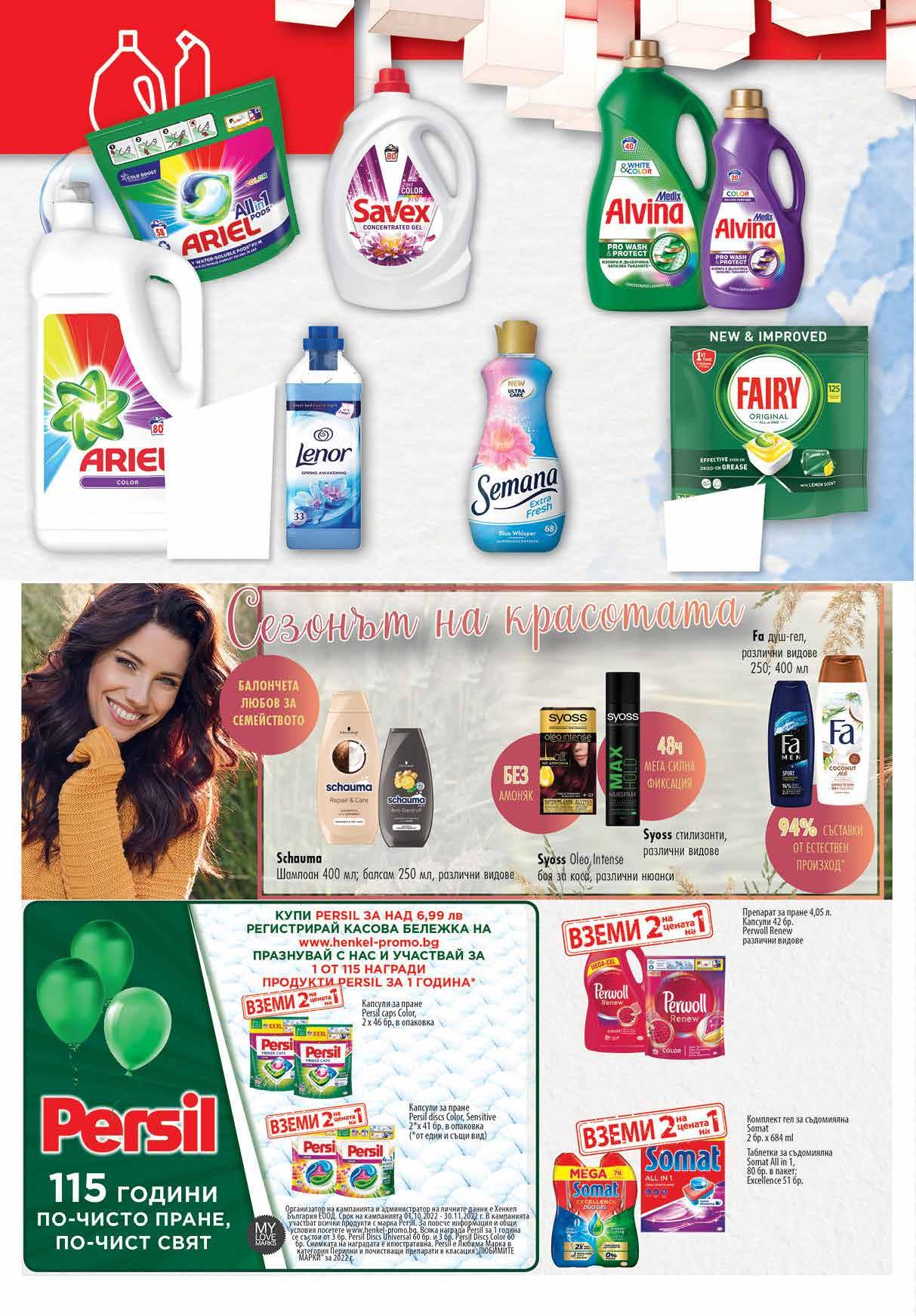 7 49 лв|бр 6 99 лв|бр 99 лв|бр6.3936 -37% 3 99 лв|бр 98* лв|2бр 69.96 -50% 34 98* лв|2бр 69.96 -50% 34 99 лв|бр29 8.89 -32% 5 99 лв|бр 99 лв|бр 31.99 -34% 20 98 лв|2бр 71.96 -50% 35 98 лв|2бр гел 71.96 -50% 35 98 лв|2бр гел 73.96 -50% 36 98 лв|2бр 73.96 -50% 36 8.59 -36% 5 49 лв|бр 1.1Л 16.35 -38% 9 99 лв|бр 2.2Л 4.98 -39% 2 99 лв|бр 250 мл 5.99 -33% 3 99 лв|бр 400 мл3 99 лв|бр Таблетки за съдомиялна FAIRY Original 125 бр; Platinum 100 бр Гел за пране 1.1 л; 2.2 л ALVINA различни видове *цената е валидна от 20.10 до 26.10.2022 Омекотител LENOR 800 мл; 1 л различни видове Гел за пране различни видове 3,96 л; 4.4 л Kапсули за пране color 58 бр; arctic color 62 бр ARIEL Омекотител SEMANA 1.65, 1.70 л; различни видове Гел за пране SAVEX color; fresh 4.4 л *от един и същи вид *от един и същи вид 22 Продуктите се продават в количества, обичайни за едно домакинство. Декорацията към продуктите не е включена в тяхната цена. ТВ „Фантастико“ си запазва правото на промяна в цените.