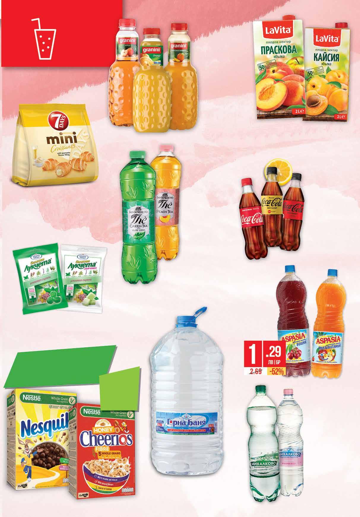 1.09 -27% 0 79 лв|бр изворна 4.19 -23% 3 19 лв|бр праскова 1.59 -21% 1 25 лв|бр3.69 -35% 2 39 лв|бр 3.69 -40% 2 19 лв|бр 3.79 -36% 2 39 лв|бр 3.25 -50% 1 62* лв|бр 1.45 -34% 0 95 лв|бр 4.19 -23% 3 19 лв|бр кайсия 1.29 -26% 0 95 лв|бр газирана *предложението е валидно за магазините с червени цени Избрани зърнени закуски NESTLE с Мини кроасани 7 DAYS шампанско 185 г *количествата са лимитирани отстъпка -34% Бонбони Лукчета ЗАХАРНИ ЗАВОДИ различни видове 75 г Плодова напитка ASPASIA различни видове 2 л Минерална вода ГОРНА БАНЯ 10 л Изворна вода; Газирана вода МИХАЛКОВО РЕТ, 1,5 л Сок/ Нектар/ Плодова напитка GRANINI различни видове 1 л Студен чай SAN BENEDETTO различни видове 1,5 л Нектар LA VITA кайсия и ябълка; праскова и ябълка 2 л Газирана безалкохолна напитка COCA-COLA; FANTA; SPRITE различни видове 500 мл 15ТВ „Фантастико” не носи отговорност за допуснати печатни грешки. Количествата са лимитирани! Предложенията са валидни до сряда 22.00ч. на 26.10.2022 г.