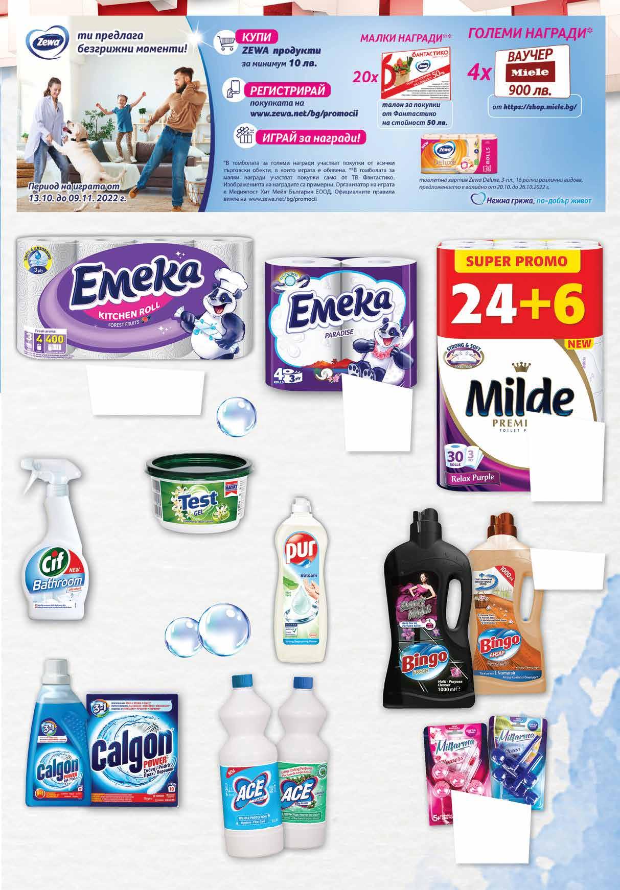 15.99 -37% 9 99 лв|бр гел 9.85 -29% 6 99 лв|бр 5.19 -32% 3 49 лв|бр 3.39 -41% 1 99 лв|бр 2.79 -21% 2 19 лв|к-т 55 г 1.99 -20% 1 59 лв|к-т 48 г 3.75 -30% 2 59 лв|бр 2.99 -33% 1 99 лв|бр classic 4.39 -41% 2 55 лв|бр 99 лв|бр21 20.59 -41% 11 99 лв|бр 2 49 лв|бр 5 49 лв|бр 2 99 лв|бр 3 49 лв|бр ламинат Тоалетна хартия EMEKA трипластова различни видове 4 бр в пакет Препарат CIF спрей различни видове 500 мл Гел против варовик Original 750 мл; Препарат против котлен камък 500 г CALGON Комплект ароматизатор за WC MILFARMA 2 бр х 48 г; 2 бр х 55 г различни видове Белина АCЕ различни видове 1 л Препарат за съдове PUR 750 мл различни видове Препарат за под BINGO различни видове 1 л Кухненско руло EMEKA 3 бр MAXI; 4 бр в пакет; 1 бр Jumbo руло различни видове Тоалетна хартия MILDE Cool Blue; Relax Purple 24+6 бр в пакет трипластова ароматизирана Препарат за съдове ТEST Gel 400 г 23ТВ „Фантастико” не носи отговорност за допуснати печатни грешки. Количествата са лимитирани! Предложенията са валидни до сряда 22.00ч. на 26.10.2022 г.