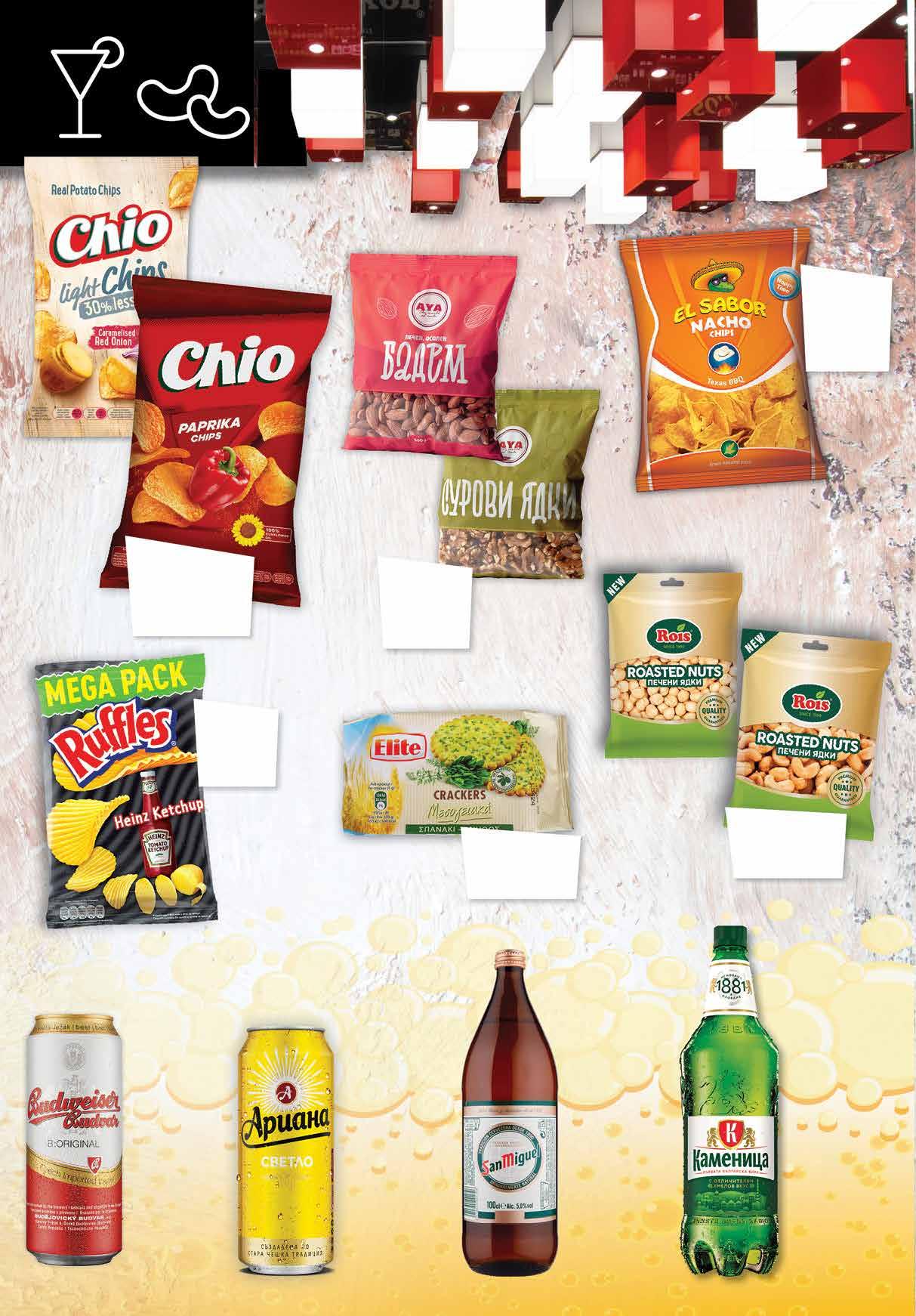 чипс EL SABOR различни вкусове 100 г Чипс CHIO различни вкусове 140 г; Чипс CHIO Light различни вкусове 125 г Печен бадем, oсолен 500 г Орех суров 400 г AYA Печени ядки ROIS кашу; лешници 140 г Крекери ELITE различни вкусове 105 г Бира КАМЕНИЦА PET, 2 л Бира SAN MIGUEL 1 л Бира АРИАНА светло кен, 500 мл Бира BUDWEISER BUDVAR кен, 500 мл 16 Продуктите се продават в количества, обичайни за едно домакинство. Декорацията към продуктите не е включена в тяхната цена. ТВ „Фантастико“ си запазва правото на промяна в цените.