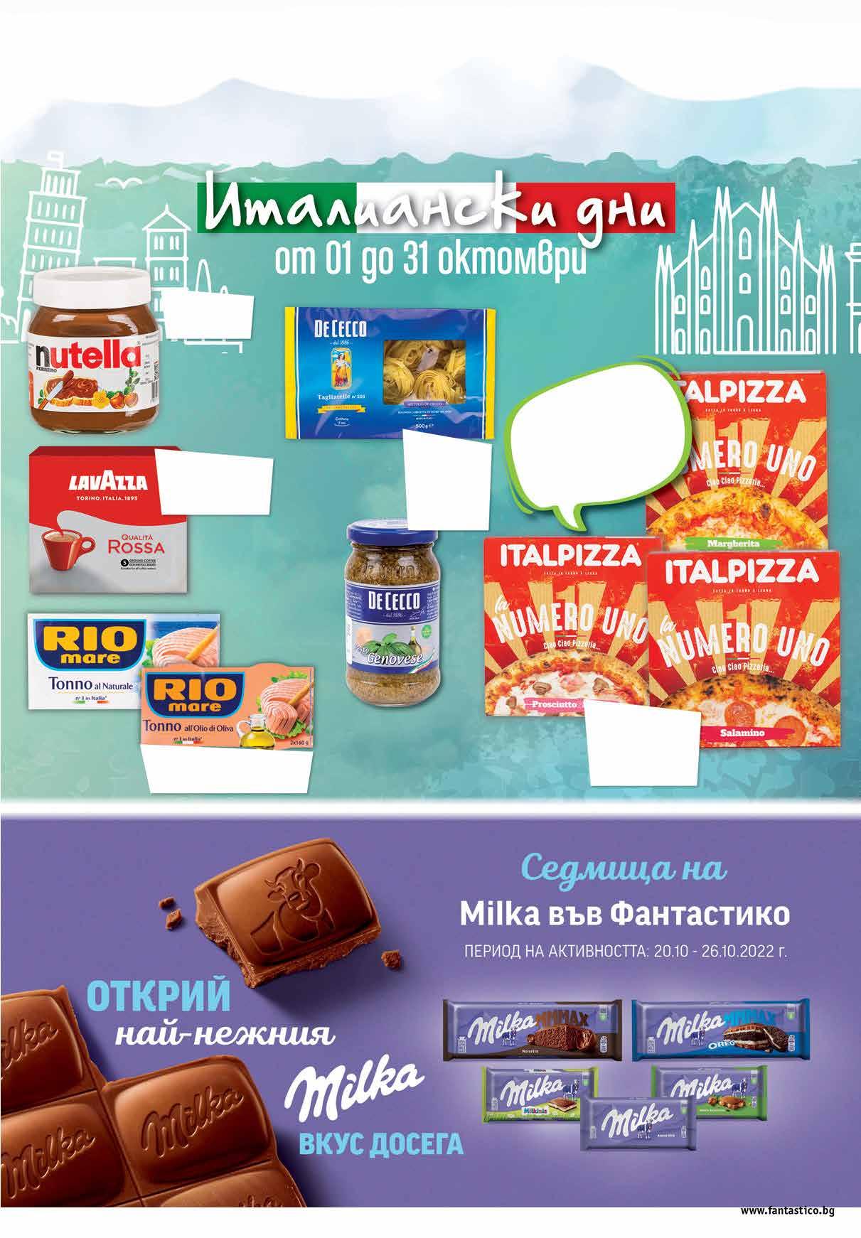7.99 -28% 5 69 лв|бр 7.99 -25% 5 99 лв|бр 15.89 -24% 11 99 лв|k-t 6.99 -28% 4 99 лв|бр 15.99 -37% 9 99 лв|оп. 6.29 -20% 4 99 лв|бр Пица LA NUMERO UNO маргарита 410; прошуто и гъби 440 г; салам пеперони 410г Риба тон RIO MARE в растително масло; натюр опаковка 2 бр х 160 г Талиатели 500 г Песто Дженовезе 190 г DE CECCO Комплект мляно кафе LAVAZZA Qualita Rossa 2 x 250 г Kакаов крем NUTELLA 400 г изключителноРъчноиздърпванапица, тънка в центъра, приготвена в истинска пещ надърва,свисока,ефирна и хрупкава коричка.За тези клиенти търсещи традицията и за любителите на тънката пица. fantastico.stores www.fantastico.bgОФЕРТА ЗА ПЕРИОДА от 20 .10.2022 г. до 22.00 ч . на 26.10.2022 г.