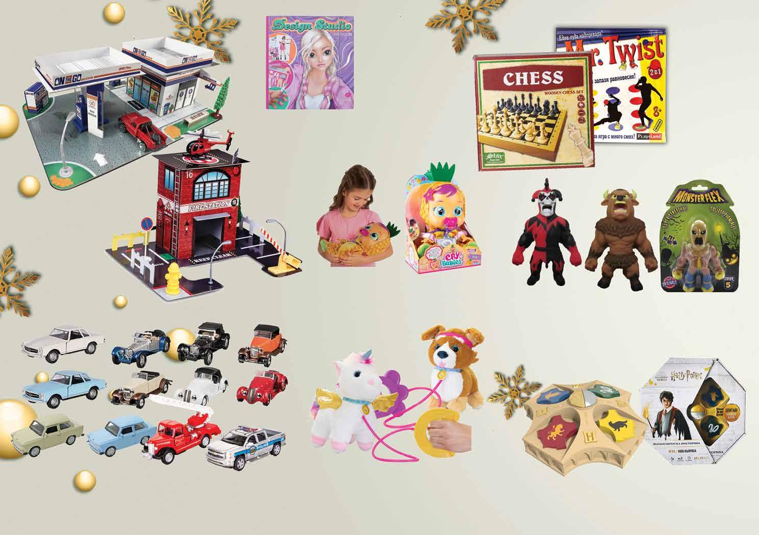 99 лв|бр mr. twist 21 99 лв|бр шах 14 99 лв|бр 10 99 лв|бр 64 99 лв|бр 29 99 лв|бр 44 99 лв|бр 13 99 лв|бр 15 99 лв|бр 59 Игра MR. TWIST Бъди гъвкав и запази равновесие! Играчка метална количка Умалени модели на: Колекция класически автомобили, Класическа пожарна кола Mercedes Benz 230SL, Полицейска кола Пожарна Chevrolet Silverado Трабант 601, 1 бр. Игра Шах 30х30 см Комплект дървени фигури Играчка MONSTER Flex W5 разтегливо чудовище Страхотна колекция от всяващи ужас чудовища с огромни челюсти и супер разтегателни тела. Зомби, вещица, луд учен, зъл гном и много други - събери ги всичките! Размери на фигурката: около 14см Играчка Бензиностанция с количка; Пожарна станция с хеликоптер Игра Harry Potter Мъгьосническа викторина Играта ще казва много странни и луди твърдения от света на Хари Потър. Познай дали са верни или неверни. Бъди бърз! Отговаряй вярно! Победи! Играчка кукла CRY BABIES Pia; Mel със сълзи Открий новия свят на Cry Babies Tutti Frutti! Сладките Мел и Пиа плачат с истински сълзи и издават сладки бебешки звуци. Книжка TOP MODEL дизайн студио В книгата са включени: 1 дизайнерски блок с фигурки TOPModel (30 листа), 1 шаблон за дрехи и аксесоари, 10 листа хартия с модерни шарки и 2 листа стикери. Играчка Любимец за разходка –дакел, далматинец, еднорог, корги Забавните любимци SPRINT са новите ти приятели за разходка. Натисни бутона и чуй веселите звуци! 26 Продуктите се продават в количества, обичайни за едно домакинство. Декорацията към продуктите не е включена в тяхната цена. ТВ „Фантастико“ си запазва правото на промяна в цените.