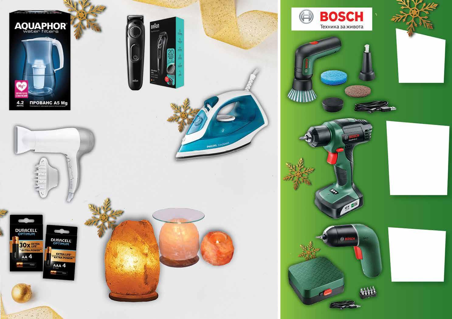 99 лв|бр лампа 33.99 -20% 26 99 лв|бр арома 42.99 -18% 34 6.99 -21% 5 49 лв|бр свещник 139 99 лв|бр 99 лв|бр 58.99 -50% 28 99 лв|бр 83.49 -30% 57 99 лв|бр 89 99 лв|бр 99 99 лв|бр 60.99 -21% 47 99 лв|бр 39.99 -45% 21 8.99 -25% 6 69 лв|бр Свещник от хималайска сол 400 г; Лампа от хималайска сол 2-3 кг; арома 1.5 кг дървена основа Филтрираща кана за вода AQUAPHOR прованс 4.2 л Акумулаторна отвертка BOSCH IXO 6 • безстепенно регулиране на оборотите • батерия- Li-ion • oбороти на празен ход: 0-215 об./мин • диаметър на винта до 5 мм. Акумулаторна универсална четка BOSCH Universalbrush • защита срещу водни пръски IPX5; • литиево-йонна акумулаторна батерия. Акумулаторен винтоверт BOSCH Easydrill 12 (1x1,5 Ah) • регулируеми обороти • батерия без "Memory" ефект • бързозатягащ патронник • LED лампа • LED индикатор показващ заряда на батерията • функция реверс. Ютия PHILIPS GC1750/20, 2000W • функция за впръскване • незалепваща плоча Сешоар CROWN HDC-1950 R 1950W • дифузер и концентратор • 2 скорости • 3 степени на температура • бутон за студен въздух Тример BRAUN BT3020/3222 • БАТЕРИЯ Li-ion • До 50 мин работа на батерия • Миеща глава Батерии DURACELL Optimum АА; ААА 4 броя в опаковка 25 ТВ „Фантастико” не носи отговорност за допуснати печатни грешки. Количествата са лимитирани! Предложенията са валидни до сряда 22.00ч. на 02.01.2023 г.
