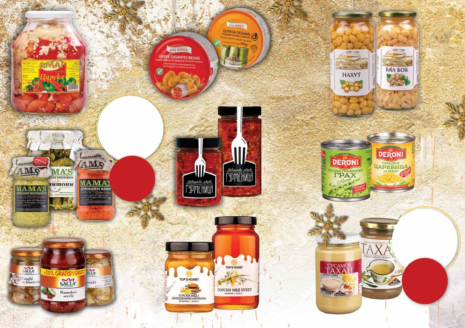 2.49 -28% 1 79 лв|бр 8.49 -27% 6 19 лв|бр 330 г 6.99 -28% 4 99 лв|бр 2.99 -23% 2 29 лв|бр 4.39 -25% 3 29 лв|бр боб 13.49 -25% 9 99 лв|бр с джинджифил 5.49 -27% 3 99 лв|бр сарми 10.99 -27% 7 99 лв|бр 490 г 99 лв|бр 18.99 -21% 14 8.99 -22% 6 99 лв|бр Бял боб; Червен боб; Нахут ФАМИЛЕКС буркан, 570 г Царска туршия АМАР 1680 г Сладка млечна царевица/ грах DERONI консерва 150 г Македонска закуска ГУРМЕНИЦА класик 490 г; 330 г Печен боб; Лозови сарми PALIRRIA 280 г Мед TOPS HONEY букет; с пита 900 г; с джинджифил и куркума 450 г Маринован артишок 285 г; Гъби 290 г; Сушени домати на слънце 340 г SACLA *предложението е валидно за магазините със сини цени Всички продукти с марка MAMA`S с Всички тахани с марка ШАЛАМАНОВ и БИЗНЕС КЪЩА с ОТСТЪПКА ОТСТЪПКА -20% -20% 8 Продуктите се продават в количества, обичайни за едно домакинство. Декорацията към продуктите не е включена в тяхната цена. ТВ „Фантастико“ си запазва правото на промяна в цените.