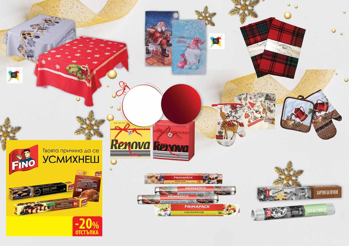 9 99 лв|бр 70/70 5 49 лв|бр кърпа 5.59 -21% 4 39 лв|бр 20м х 29см 3 39 лв|бр 30/50 3 49 лв|бр ръкавица 2 49 лв|бр 10м х 29см 2.69 -26% 1 99 лв|бр 30м 2 89 лв|бр хартия 99 лв|бР 100/150 15 99 лв|бр 150/200 19 99 лв|бр 120/140 21 1 59 лв|бр 2 19 лв|бр хартия 5 49 лв|к-т Хартия за печене 8 м; Oпаковачно фолио 30 м ANNA ZARADNA Алуминиево фолио 10м х 29см; 20м х 29см; Хартия за печене 8м х 38см; Oпаковъчно фолио 30 м PRIMAPACK Коледна кърпа с печат 30/50 см Коледна покривка минимат 100/150 см; 150/200 см; Коледна кърпа с печат 30/50 см ВСИЧКИ ХАРТИИ, ПЛИКОВЕ, ПРОТЕКТОР И КИЛИМ ЗА ПЕЧЕНЕ С Кухненски комплект ръкавица + ръкохватка DURATEX Покривка за маса коледно каре DURATEX 100% памук, 120/140 см, 70/70 см различни десени Коледна кърпа 40/60см с ресни; Кухненска ръкавица 25 см; DURATEX Всички салфетки с марка RENOVA с ОТСТЪПКА МИНИМУМ -20% *предложението е валидно за магазините със зелени цени *предложението е валидно за магазините със сини цени 30 Продуктите се продават в количества, обичайни за едно домакинство. Декорацията към продуктите не е включена в тяхната цена. ТВ „Фантастико“ си запазва правото на промяна в цените.