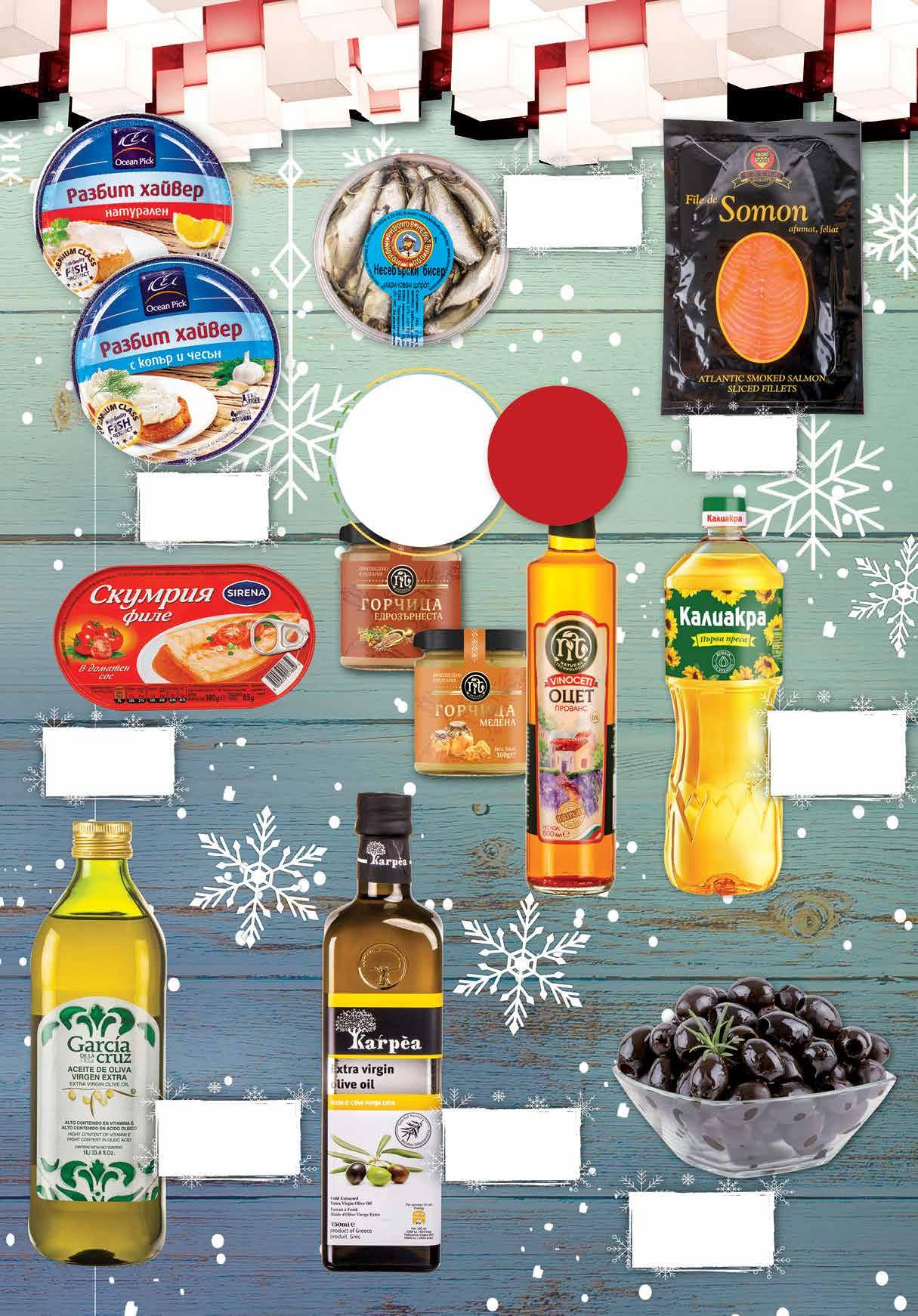 13.49 -25% 9 99 лв|бр 2.69 -26% 1 99 лв|бр 99 лв|бр 18.79 -30% 12 99 лв|бр 16.49 -33% 10 3.39 -29% 2 39 лв|бр 13.99 -28% 9 99 лв|kг 3.49 -28% 2 49 лв|бр 5.49 -18% 4 49 лв|бр отстъпка минимум -25% Сьомга филе NEGRO пушена, 200 г Черни маслини без костилка Мамут насипни от щандова витриана Скумрия филе SIRENA различни видове 180 г Мариновани шпроти НЕСЕБЪРСКИ БИСЕР 200 г Разбит хайвер OCEAN PICK различни видове 160 г Маслиново масло Екстра Върджин GARCIA DE LA CRUZ 1 л Маслиново масло Екстра Върджин KARPEA 750 мл Слънчогледово олио КАЛИАКРА Първа преса 1 л *предложението е валидно за магазините със сини цени Всички видове оцет и горчица с марка NT с 5 ТВ „Фантастико” не носи отговорност за допуснати печатни грешки. Количествата са лимитирани! Предложенията са валидни до сряда 22.00ч. на 14.12.2022 г.