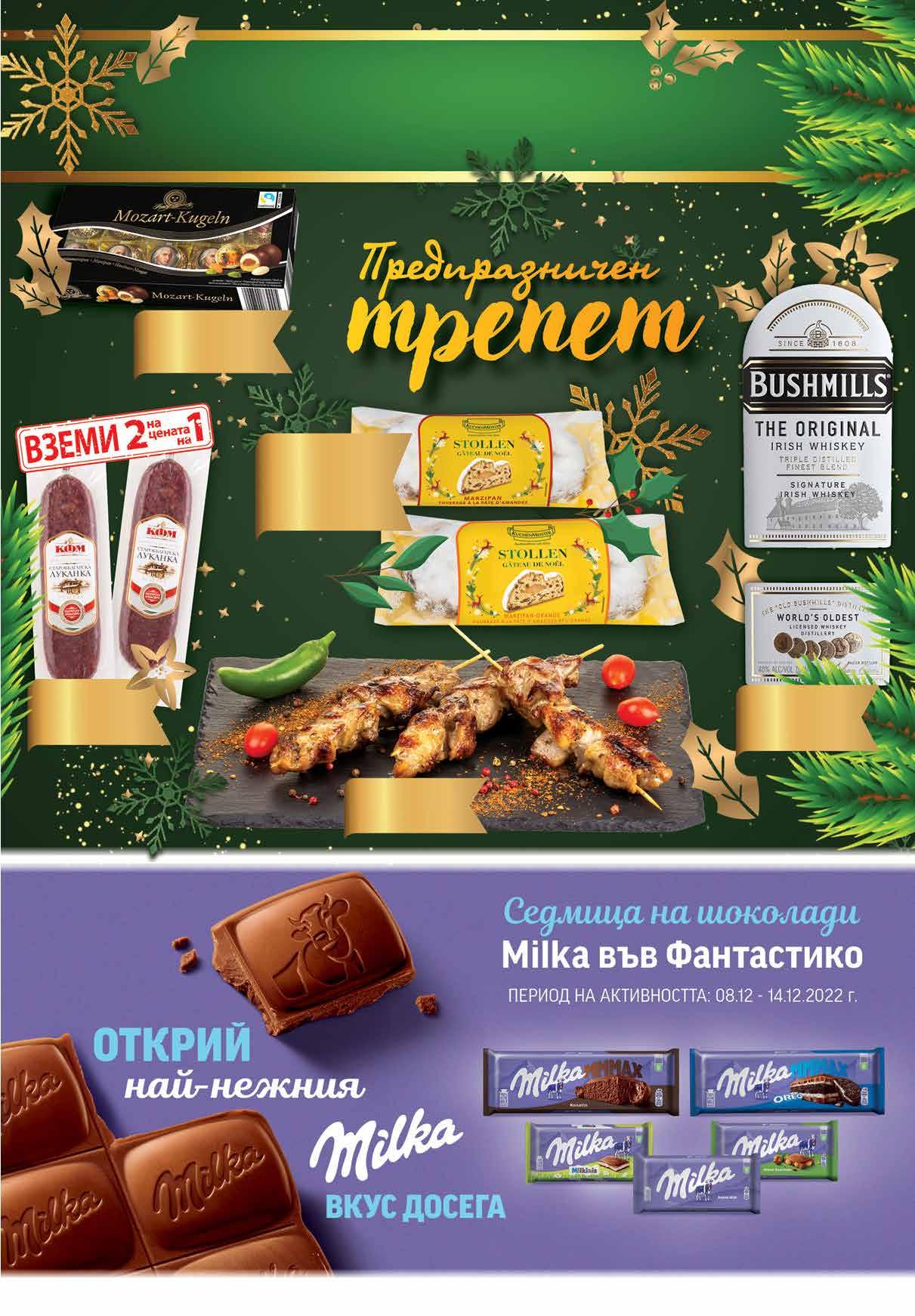 10.99 -36% 6 99 лв|бр 7.79 -40% 4 65 лв|бр 16.96 -50% 8 48 лв|2бр 2.49 -36% 1 59 лв|бр 99 лв|бр 31.99 -31% 21 Коледен щолен* KUCHENMEISTER портокал и марципан; марципан 500 г *количествата са лимитирани Бонбони MOZART - KUGELN 200 г Луканка Старобългарска КФМ вакуум, 2 бр х 170 г Печено свинско шишче Ирландско уиски BUSHMILLS Тhе Original 700 мл www.fantastico.bg fantastico.stores ОФЕРТА ЗА ПЕРИОДА от 08 .12.2022 г. до 22.00 ч . на 14.12.2022 г.