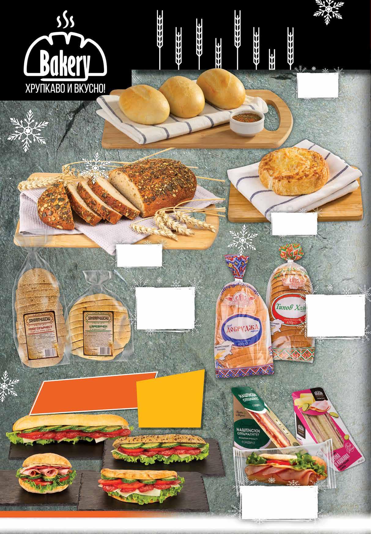 0.49 -28% 0 35 лв|бр 1.69 -29% 1 19 лв|бр 4.69 -20% 3 75 лв|бр 2.19 -27% 1 59 лв|бр 2.19 -22% 1 69 лв|бр 3.49 -28% 2 49 лв|бр Картофено хлебче 70 г Кашкавалка XL 115 г Протеинов хляб 400 г Сандвич BALKAN нашенски специалитет 200 г; шунка и кашкавал 200 г; чабата Ница 280 г Хляб Занаятчийски ДОБРУДЖАНСКИ ХЛЯБ многозърнест; царевичен нарязан, 400 г Нарязан хляб ЕЛИАЗ Tипов; Добруджа Утвърден стандарт България 650 г Вземи сандвич с луканка с отстъпка -20% *предложението е валидно за магазините със сини цени 10 Продуктите се продават в количества, обичайни за едно домакинство. Декорацията към продуктите не е включена в тяхната цена. ТВ „Фантастико“ си запазва правото на промяна в цените.
