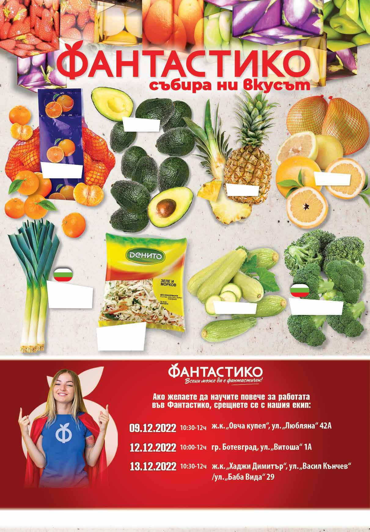 1.29 -31% 0 89 лв|бр 1.69 -41% 0 99 лв|бр 3.19 -25% 2 39 лв|бр 4.59 -43% 2 59 лв|бр 4.59 -34% 2 99 лв|бр 2.29 -21% 1 79 лв|кг 3.59 -27% 2 59 лв|кг 3.99 -25% 2 99 лв|кг Мандарини мрежа Помело калибър 10 Авокадо калибър 26 Ананас Броколи произход България Тиквички Праз лук 3 бр връзка произход България Салата зеле и моркови ДЕНИТО свежа, 400 г Продуктите, обозначени с този символ, са с БЪЛГАРСКИ произход. Снимките са с илюстративна цел. ТВ „Фантастико” не носи отговорност за допуснати печатни грешки. Количествата са лимитирани! Предложенията са валидни до сряда 22.00 ч на 14.12.2022 г.