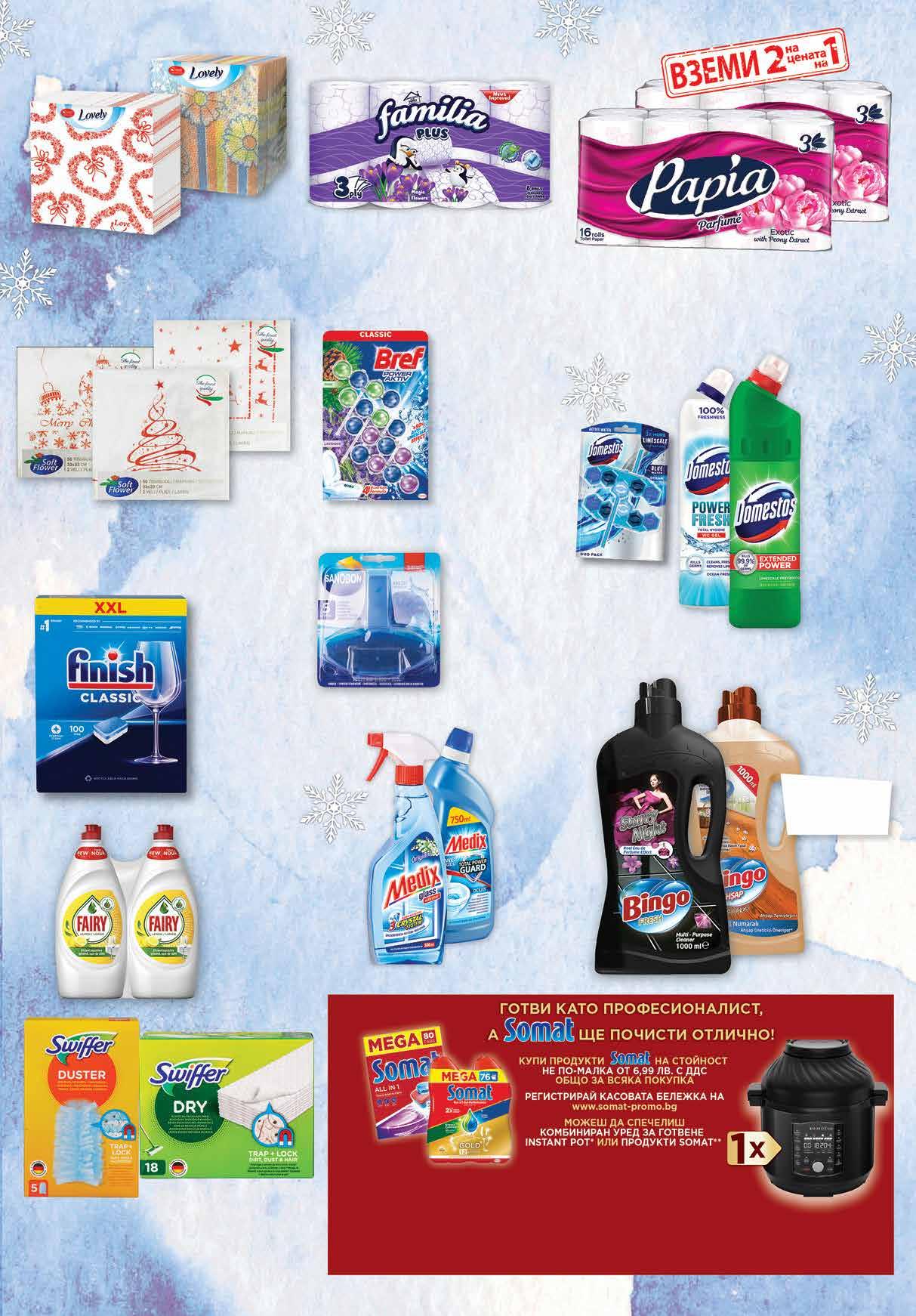 6.99 -28% 4 99 лв|бр 7 69 лв|к-т 8.49 -29% 5 99 лв|оп. 98 лв|2 оп. 37.96 -50% 18 99* лв|оп. 36.98 -40% 21 2 99 лв|бр 3 49 лв|бр ламинат 4.45 -32% 2 99 лв|бр 5.99 -33% 3 99 лв|бр 7.44 -46% 3 99 лв|k-t 11.99 -41% 6 99 лв|к-т 99 лв|бр 29.99 -40% 17 2 49 лв|бр 1.45 -38% 0 89 лв|бр 2.99 -33% 1 99 лв|бр Комплект ароматизатор WC Blue Water; Pink Water 2 бр х 53г; Универсален препарат DOMESTOS WC Total 700 мл; различни видове 750 мл Таблетки за съдомиялна машина FINISH Classic 100 бр в опаковка Тоалетна хартия PAPIA Parfume White; Exotic трипластова 2* оп. х 16 бр в опаковка *от един и същи вид Ароматизатор за WC SANO различни видове кошница, 55 мл Tаблетки за съдомиялна All in 1, 80 бр в опаковка; Excellencе 51 бр в опаковка Комплект гел за съдомиялна 2 бр х 684 мл SOMAT *цената е валидна за перода от 08.12. до 14.12.2022г. Препарат MEDIX експерт; за стъкла помпа 500 мл; WC гел 750 мл Резерви SWIFFER за четки за прах 5 бр в опаковка; сухи кърпи за под 18 бр в опаковка Комплект препарат за съдове FAIRY 2 бр х 800 мл; Extra 2 бр х 650 мл; Max Power 2 бр х 450 мл различни видове Препарат за под BINGO различни видове 1 л Тоалетна хартия FAMILIA трипластова различни видове 8 бр в опаковка Комплект ароматизатор за WC BREF Power Aktiv 4 бр х 50 г различни видове Салфетки с печат LOVELY 33х33 см 50 бр в опаковка Салфетки SOFT FLOWER 33х33 см различни видове 50 бр в опаковка 23 ТВ „Фантастико” не носи отговорност за допуснати печатни грешки. Количествата са лимитирани! Предложенията са валидни до сряда 22.00ч. на 14.12.2022 г.