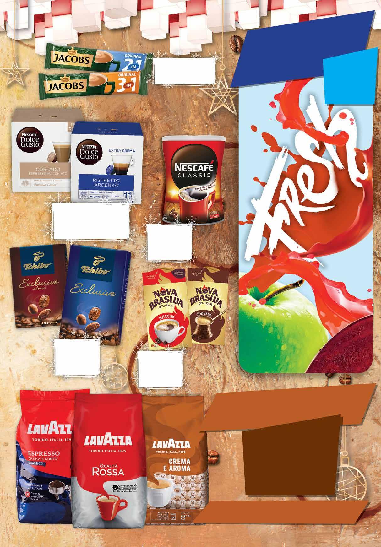 7.99 -37% 4 99 лв|бр 7.99 -37% 4 99 лв|бр Intense 0.42 -31% 0 29 лв|бр 10.99 -20% 8 79* лв|бр 2.35 -28% 1 69 лв|бр 14.69 -38% 8 99 лв|бр Разтворимо кафе NESCAFE Classic 250 г Мляно кафе TCHIBO Exclusive; Exclusive Intense 250 г Кафе капсули NESCAFE Dolce Gusto различни видове 16 бр кутия *цената не важи за Cafe au lait и Flat white Всички видове кафе на зърна с марка LAVAZZA с *предложението е валидно за магазините със зелени цени и не важи за Lavazza Crema е Gusto 2 бр х 1 кг отстъпка -30% минимум Разтворимо кафе JACOBS 2in1 14 г; 3in1 12,5-18 г различни видове Мляно кафе NOVA BRAZILIA класик; джезве 100 г ябълка и цвекло Фреш ябълка и цвекло с отстъпка -33% *предложението е валидно за магазините със сини цени 13 ТВ „Фантастико” не носи отговорност за допуснати печатни грешки. Количествата са лимитирани! Предложенията са валидни до сряда 22.00ч. на 14.12.2022 г.