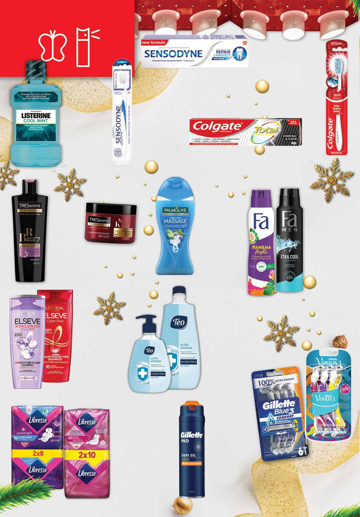 2 59 лв|бр пълнител 2 39 лв|бр помпа 6 49 лв|бр 3 69 лв|бр 5.99 -41% 3 49 лв|бр 3 69 лв|бр men 8.29 -39% 4 99 лв|бр 11.99 -33% 7 99 лв|бр 11.99 -33% 7 99 лв|бр 6.29 -42% 3 59 лв|бр четка 6.09 -34% 3 99 лв|оп. Goodnight 6.09 -34% 3 99 лв|оп. 5.75 -41% 3 39 лв|бр 9.99 -40% 5 99 лв|бр маска 5 69 лв|бр 5 69 лв|бр 9.99 -40% 5 99 лв|бр 99 лв|бр 11 99 лв|бр blue 3 11 Шампоан 250 мл; Балсам 200 мл; ELSEVE различни видове Балсам 400 мл; Шампоан 400 мл; Маска 300 мл TRESEMME различни видове Вода за уста LISTERINE Cool Mint 1 л Гел за бръснене GILLETTE различни видове 170мл; 200 мл Самобръсначки GILLETTE Venus Start -3 ножчета; Venus Multicolor - 6 бр.; Skinguard - 6 бр. Blue 3 6 бр.; Sensor 3 - 6 бр.; Четка за зъби SENSODYNE Advanced Clean Soft; Gentle Care Soft 1 бр Четка за зъби COLGATE 360° Optic White 1 бр; Interdental Soft 1 бр Паста за зъби SENSODYNE Complete Protection; Nourish; Sensitivity & Gum; Repair & Protect; Rapid Relief; Repair & Protect Избелваща; Rapid Relief Избелваща 75 мл Дамски превръзки LIBRESSE Duo Pack различни видове 16; 20 бр в опаковка Део спрей 150 мл Део ролон 50 мл Део стик 50 мл FA различни видове PALMOLIVE Душ гел 250 мл различни видове Паста за зъби COLGATE Тоtаl различни видове 75 мл; 100 мл Течен сапун ТЕО помпа 400 мл; пълнител 800 мл различни видове 20 Продуктите се продават в количества, обичайни за едно домакинство. Декорацията към продуктите не е включена в тяхната цена. ТВ „Фантастико“ си запазва правото на промяна в цените.