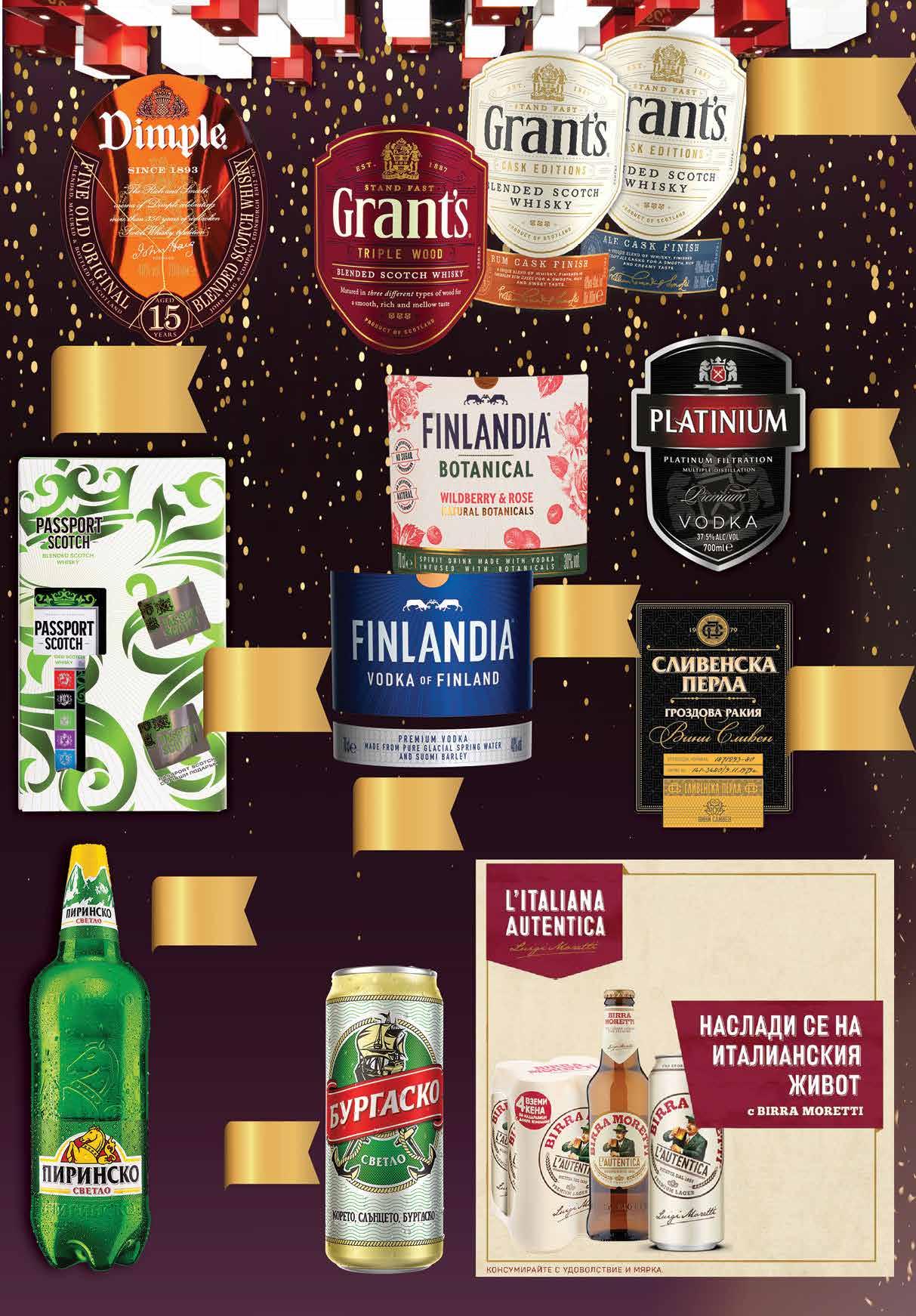 99 лв|бр classic 21.99 -22% 16 99 лв|бр 19.99 -25% 14 99 лв|бр botanical 21.99 -22% 16 2 19 лв|бр 99 лв|бр 22.99 -34% 14 1.45 -34% 0 95 лв|бр 99 лв|бр 77.99 -24% 58 99 лв|бр 24.99 -28% 17 99 лв|бр rum; Ale 24.99 -28% 17 10.99 -27% 7 99 лв|бр 1.99 -25% 1 49 лв|бр 330 мл 1.79 -27% 1 29 лв|бр КЕН 4 49 лв|бр мултипак Бира БУРГАСКО кен, 500 мл Гроздова ракия СЛИВЕНСКА ПЕРЛА 500 мл Водка FINLANDIA Classic 700 мл Спиртна напитка FINLANDIA Botanical 700 мл Шотландско уиски PASSPORT 700 мл + 2 чаши Шотландско уиски DIMPLE 15 годишно 700 мл Шотландско уиски GRANT‘S Triple Wood; Ale Cask; Rum Cask 700 мл Бира ПИРИНСКО светло ПЕТ, 2 л Водка PLATINIUM 700 мл Бира MORETTI бутилка 330 мл; кен 500 мл; мултипак кен 4 бр х 500 мл 17 ТВ „Фантастико” не носи отговорност за допуснати печатни грешки. Количествата са лимитирани! Предложенията са валидни до сряда 22.00ч. на 14.12.2022 г.