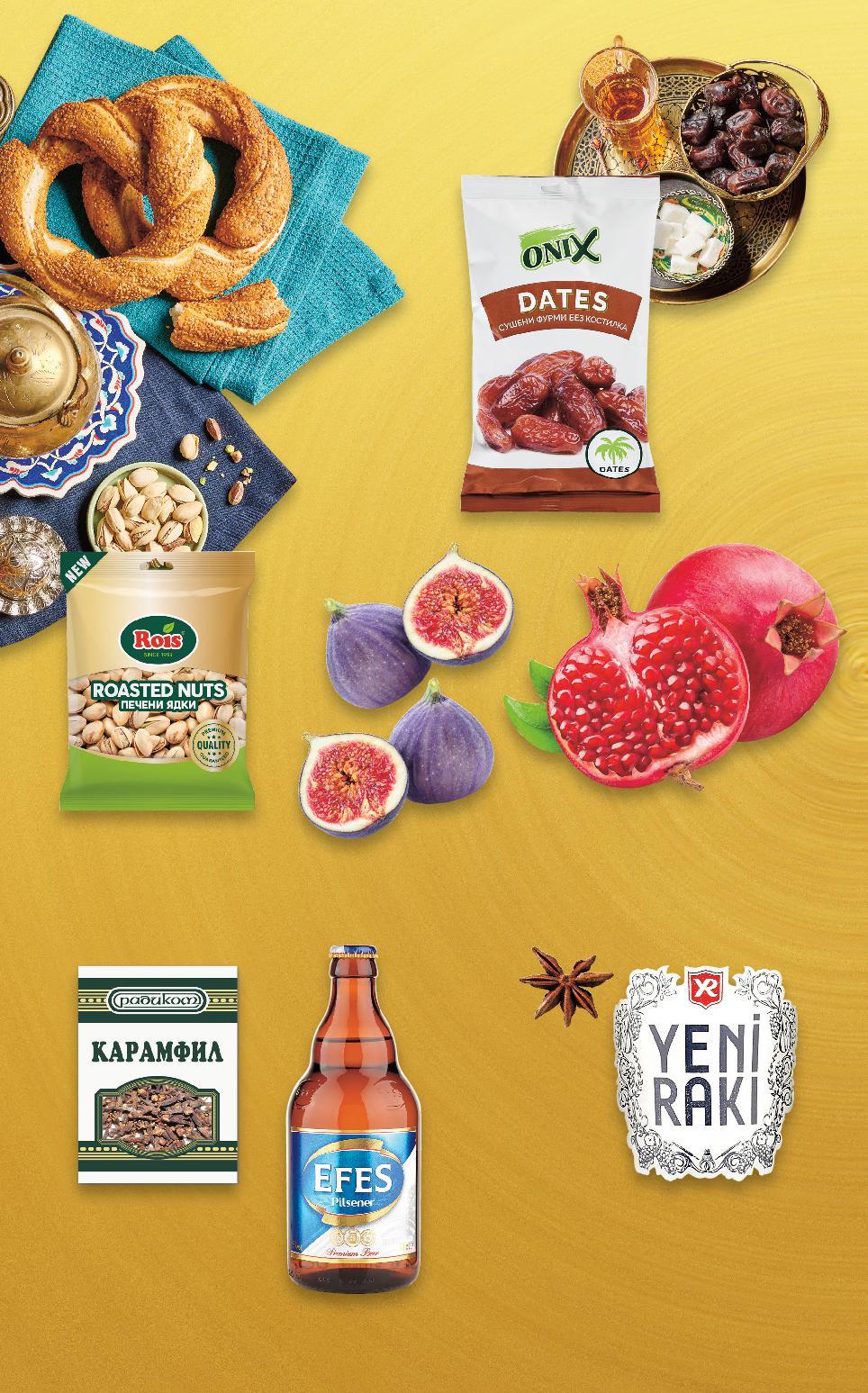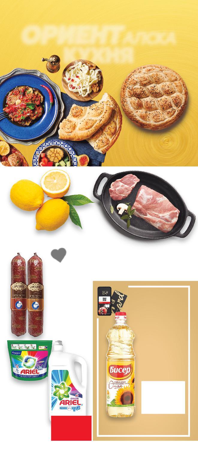 Цените са валидни за посочените на последна страница хипермаркети. Стоките се продават в количества, обичайни за едно домакинство. Всички цени са в лева с включен ДДС. Всички артикули се предлагат без декорация. Снимките са примерни. ОРИЕНТАЛСКА КУХНЯ -30% 5,39 7,79 -31% 19,99 28,99 -37% 0,99 1,59 0,59 само -34% 1,49 2,29 2,19 само -33% 0,59 0,89 -53% 0,69 1,49ROIS Шамфъстък печен 140 г (1 кг = 38,50) YENI RAKI Анасонова напитка Произход: Турция 45% vol 0,7 л (1 л = 28,56) SIMIT Турски геврек със сусам 110 г (1 кг = 9,00) Смокини Клас: I бр. EFES Бира Произход: Турция 5% vol 0,5 л бутилка (1 л = 2,98) ROIS Фурми без костилка ONIX 350 г (1 кг = 6,26) РАДИКОМ Карамфил 5 г (1 кг = 118,00) Нар Клас: I бр. S6-BG-KW41-LFT-ORIENT2_L-1000-10 6