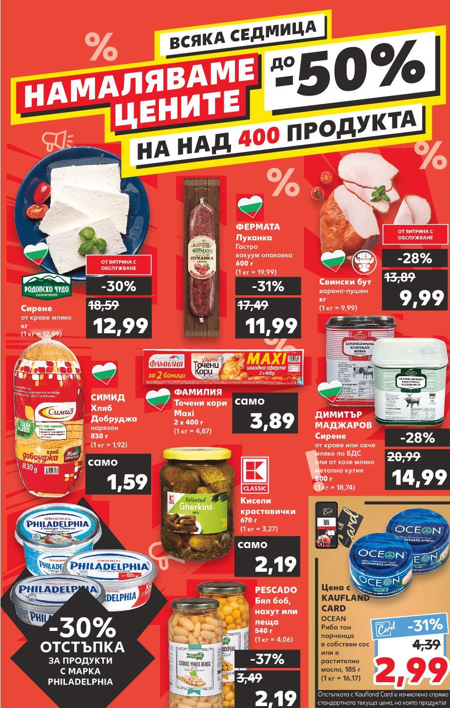 ! Цените са валидни за посочените на последна страница хипермаркети Стоките се продават в количества, обичайни за едно домакинство Всички цени са в лева с включен ДДС. Всички артикули се предлагат без декорация. Снимките са примерни. ните -30% ОТСТЪПКА ЗА ПРОДУКТИ С МАРКА PHILADELPHIA -37% 2,19 3,49 -31% 11,99 17,49 3,89 само 1,59 само -28% 14,99 20,99 2,19 само -28% 9,99 13,89-30% 12,99 18,59 -31% 2,99 4,39само само PESCADO Бял боб, нахут или леща 540 г (1 кг = 4,06) ФЕРМАТА Луканка Гастро вакуум опаковка 600 г (1 кг = 19,99) ФАМИЛИЯ Точени кори Maxi 2 x 400 г (1 кг = 4,87) СИМИД Хляб Добруджа нарязан 830 г (1 кг = 1,92) ДИМИТЪР МАДЖАРОВ Сирене от краве или овче мляко по БДС или от козе мляко метална кутия 800 г (1 кг = 18,74) Кисели краставички 670 г (1 кг = 3,27) Сирене от краве мляко кг (1 кг = 12,99) Свински бут варено-пушен кг (1 кг = 9,99) OCEAN Риба тон парченца в собствен сос или в растително масло, 185 г (1 кг = 16,17) Цена с KAUFLAND CARD ВСЯКА СЕДМИЦА-50%ДОНАМАЛЯВАМЕ ЦЕНИТЕ НА НАД 400 ПРОДУКТА Отстъпката с Kaufland Card e изчислена спрямо стандартната текуща цена, на която продуктът се предлага в хипермаркета. S2-BG-KW41-LFT-TOP_L-1000-10 2