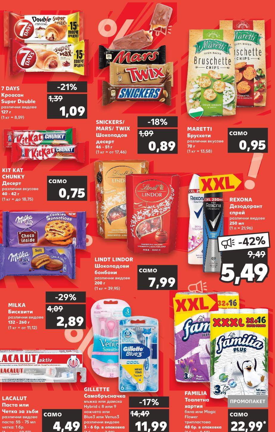 ! *Със звездичка са обозначени артикулите, които са специално предложение до изчерпване на наличностите. Kaufland не носи отговорност за печатни грешки. -21% 1,09 1,39 -18% 0,89 1,09 0,95 само -17% 11,99 14,49 4,49 само 7,99 само 0,75 само 22,99* само -29% 2,89 4,09 -42% 5,49 9,49 GILLETTE Самобръсначка мъжка или дамска Hybrid с 8 или 9 ножчета или Blue3 или Venus3 различни видове 3 - 6 бр. в опаковка (1 бр. = от 2,00) 7 DAYS Кроасан Super Double различни видове 127 г (1 кг = 8,59) LACALUT Паста или Четка за зъби различни видове паста: 55 - 75 мл четка: 1 бр. (1 л = от 59,87) SNICKERS/ MARS/ TWIX Шоколадов десерт 46 - 51 г (1 кг = от 17,46) MARETTI Брускети различни вкусове 70 г (1 кг = 13,58) LINDT LINDOR Шоколадови бонбони различни видове 200 г (1 кг = 39,95) KIT KAT CHUNKY Десерт различни вкусове 40 - 42 г (1 кг = до 18,75) FAMILIA Тоалетна хартия бяла или Magic Flower трипластова 48 бр. в опаковка (1 бр. = 0,48) MILKA Бисквити различни видове 132 - 260 г (1 кг = от 11,12) REXONA Дезодорант спрей различни видове 250 мл (1 л = 21,96) ПРОМОПАКЕТ S3-BG-KW41-LFT-TOP_R-1000-10 3
