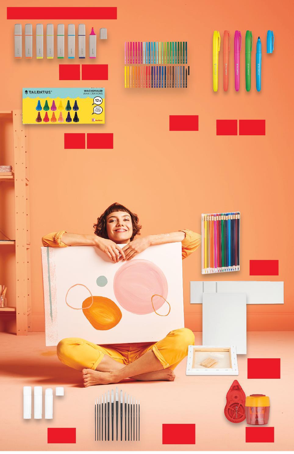 РАЗКРИЙ СВОЯ ТАЛАНТ С Стоките се продават в количества, обичайни за едно домакинство. Всички цени са в лева с включен ДДС. Всички артикули се предлагат без декорация. Снимките са примерни. СОБСТВЕНИ МАРКИ 4,99* 3,69* 2,59* TALENTUS Комплект флумастери блестящи TALENTUS Комплект цветни моливи TALENTUS Сухо лепило 8 г 3,69* 6,99 4,99 2,99 9,29 -24% 6,59 -24% 3,67 -18% TALENTUS Острилка TALENTUS Текст маркери TALENTUS Комплект пастели TALENTUS Хайлайтър 12 броя 16 броя 48 броя 8 броя 3 броя 5 броя за кратко при нас 6,99* 12,99* TALENTUS Комплект четки за рисуване различни видове 15 бр. или 12 бр. TALENTUS Комплект платна за рисуване различни размери 22 S22-BG-KW11-CL4-Pano09_OHZ_1_L-1000-10 22