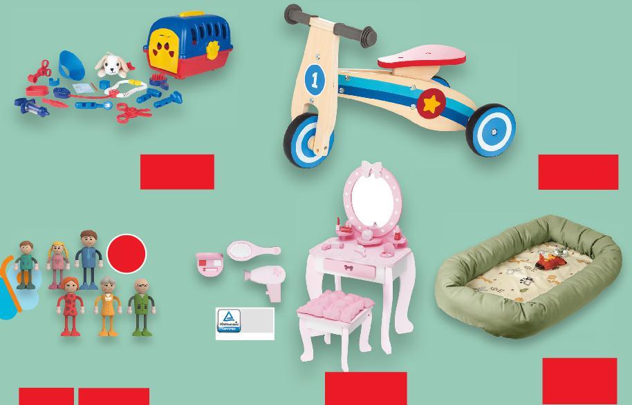 Всички Kaufland Card отстъпки са изчислени спрямо стандартната текуща цена, на която продуктът се предлага в хипермаркета. *Със звездичка са обозначени артикулите, които са специално предложение до изчерпване на наличностите. Kaufland не носи отговорност за печатни грешки. 119,90 KIDLAND Детска кухня готварска печка, хладилник, микровълнова, дъска за писане, 66 x 97 x 30 см, вкл. аксесоари 3+ 29,99 KIDLAND Дървена играчка различни видове 97 см 66 см 30 см при нас 69,99* Бебешко гнездо различни мотиви, 80 x 44 x 11 cм 3+ 89,99 KIDLAND Дървена къща за кукли спалня, хол, кухня, баня, 2 кукли,