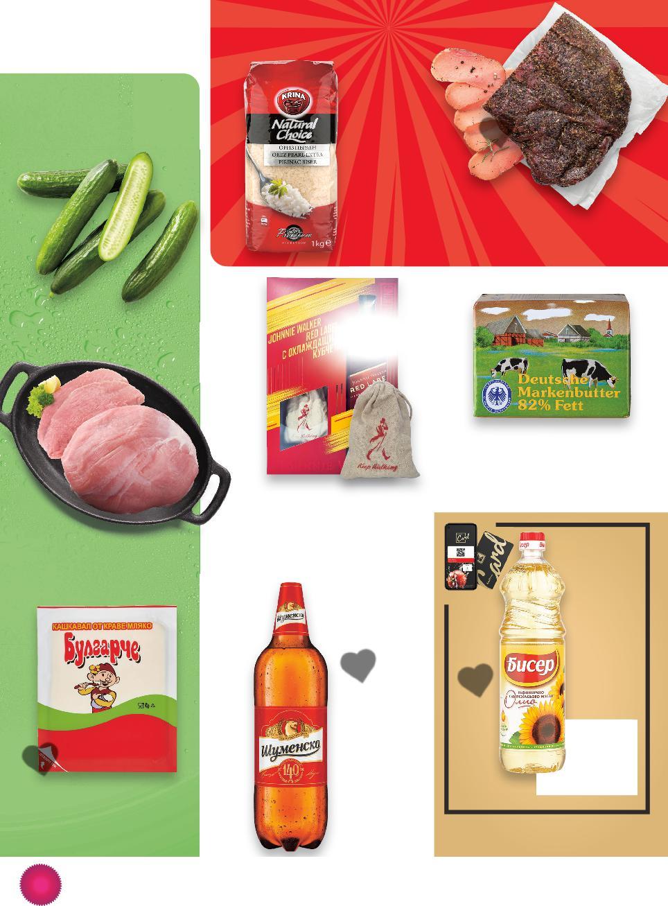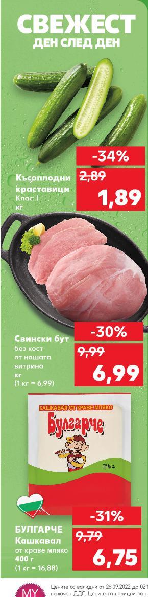 Отстъпката с Kaufland Card e изчислена спрямо стандартната текуща цена, на която продуктът се предлага в хипермаркета. -40% 2,39 3,99 -30% 6,99 9,99 4,95 само -32% 1,85 2,75 -31% 6,75 9,79 -41% 22,89 38,89 -34% 1,89 2,89 -31% 19,99 28,99 -18% 4,49 с5,49 5,49 амо само ДО 15 БРОЯ НА ПОКУПКА** **При покупка над 15 бр. всеки следващ продукт се продава на стандартна цена.ШУМЕНСКО Бира 4,8% vol 2 л PET (1 л = 0,93) БУЛГАРЧЕ Кашкавал от краве мляко 400 г (1 кг = 16,88) KRINA Ориз перлен 1 кг (1 кг = 2,39) Филе Елена от нашата витрина кг (1 кг = 22,89) Късоплодни краставици Клас: I кг Свински бут без кост от нашата витрина кг (1 кг = 6,99) DEUTSCHE MARKENBUTTER Краве масло 82% масленост 250 г (1 кг = 19,80)JOHNNIE WALKER Уиски Red Label 40% vol 0,7 л + кубчета лед (1 л = 28,56) БИСЕР Олио слънчогледово 1 л (1 л = 4,49) Цена с KAUFLAND CARD СТР. 2 - 5 ВСЯКА СЕДМИЦА-50%ДОНАМАЛЯВАМЕ ЦЕНИТЕ НА НАД 400 ПРОДУКТА Цените са валидни от 26.09.2022 до 02.10.2022 или до изчерпване на наличностите. Стоките се продават в количества, обичайни за едно домакинство. Всички цени са в лева с включен ДДС. Цените са валидни за посочените на последна страница хипермаркети. Kaufland не носи отговорност за печатни грешки. Всички артикули се предлагат без декорация. Снимките са примерни. Предложенията може да видиш и на kaufland.bg. Повече за Моите любими марки научи на kaufland.bg/otlichiya. *Със звездичка са обозначени артикулите, които са специално предложение до изчерпване на наличностите. ОТ ПОНЕДЕЛНИК, 26.09.2022 ДО НЕДЕЛЯ, 02.10.2022 СВЕЖЕСТ ДЕН СЛЕД ДЕН S1-BG-KW39-LFT-TS-1000-10