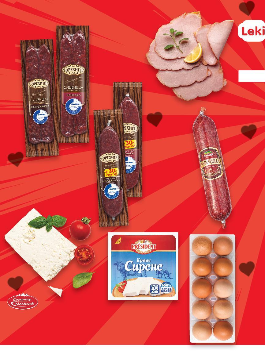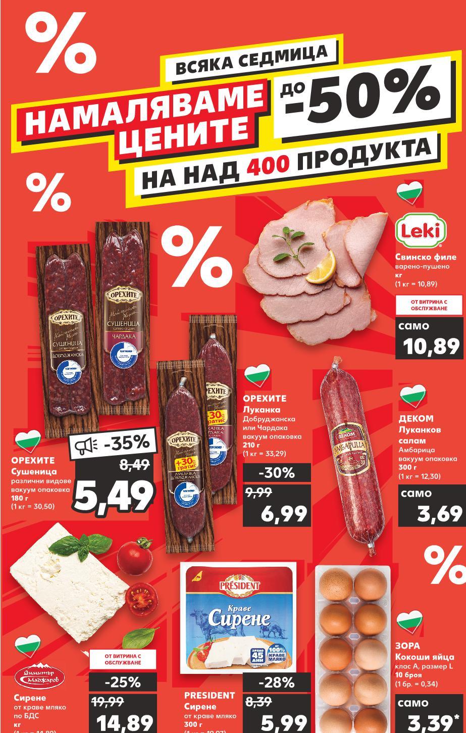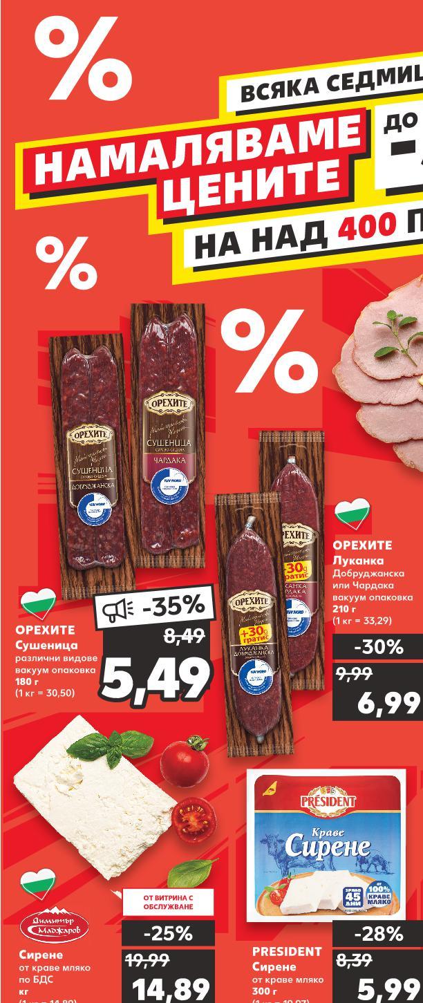 *Със звездичка са обозначени артикулите, които са специално предложение до изчерпване на наличностите. Kaufland не носи отговорност за печатни грешки. СВЕЖО ОТ НАШАТА ВИТРИНА КОЛИЧЕСТВА СПОРЕД ПРЕДПОЧИТАНИЯТА ВЪЗМОЖНОСТ ЗА ДЕГУСТАЦИЯ НА МЯСТО СПЕЦИАЛИТЕТИ ОТ СЕЛЕКТИРАНИ БЪЛГАРСКИ ПРОИЗВОДИТЕЛИ -34% 27,99 42,99 -23% 4,99 6,49 -28% 8,89 12,49 -40% 11,89 19,89 -25% 22,99 30,99 -33% 19,99 29,89 -24% 34,89 45,99Бабек, Бански старец или Джумайска луканка крафт колекция кг (1 кг = 27,99) Кренвирши пилешки кг (1 кг = 4,99) Наденица македонска, лионска или родопска кг (1 кг = 8,89) Пуешки деликатес кг (1 кг = 11,89) Горнооряховски бекон домашен по специална рецепта от Горна Оряховица кг (1 кг = 22,99) Свинска рибица варено-пушена с ронена чубрица кг (1 кг = 19,99) Луканка Маджаров или Стандарт Маджаров сурово-сушена с благородна плесен кг (1 кг = 34,89) с ароматни подправки сурово-сушен 30 дни с едросмлян черен пипер S15-BG-KW39-LFT-BED2_R-1000-10 15