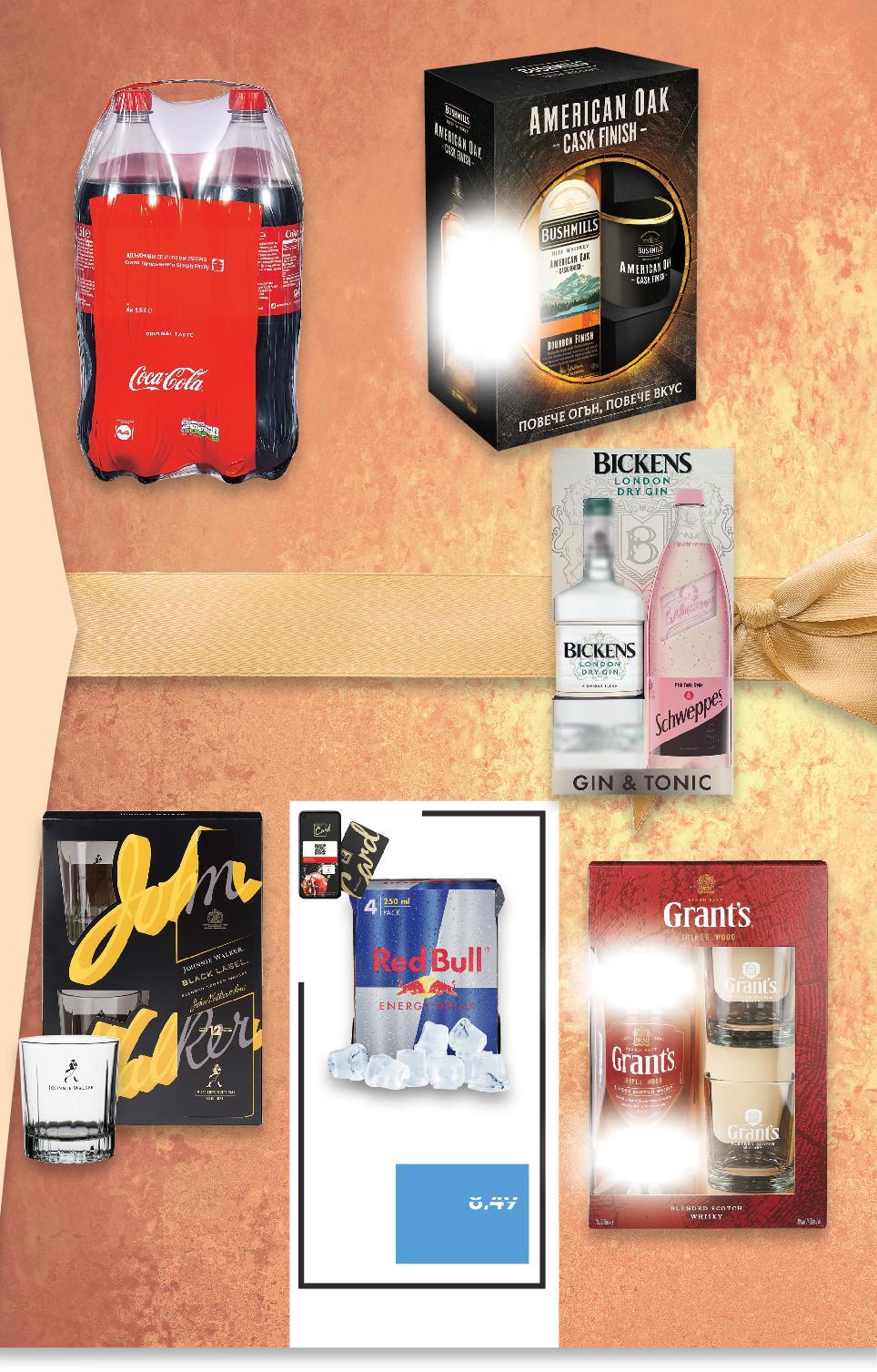 Цените са валидни за посочените на последна страница хипермаркети. Стоките се продават в количества, обичайни за едно домакинство. Всички цени са в лева с включен ДДС. Всички артикули се предлагат без декорация. Снимките са примерни. СУПЕР ИДЕИ НА ИЗГОДНИ ЦЕНИ -25% 26,99 35,99 -26% 38,99 52,99 -29% 18,99 26,99 3,19* само -23% 6,49 с8,49 8,49 амо само -30% 25,99 37,49 ✓ 12-годишно BICKENS + SCHWEPPES PINK Джин 1 л + Тоник 1,25 л 40% vol промопакет (1 л = 12,00) JOHNNIE WALKER Шотландско уиски Black Label 40% vol 0,7 л + 2 чаши (1 л = 55,70) GRANT‘S Скоч уиски 40% vol 0,7 л + 2 чаши (1 л = 27,13) COCA COLA Газирана напитка промопакет 2 x 1,5 л (1 л = 1,07) RED BULL Енергийна напитка промопакет 4 бр. х 250 мл (1 л = 6,49) Цена с KAUFLAND CARD BUSHMILLS Ирландско уиски Caribbean Rum Cask Finish / Вourbon Cask 40% vol 0,7 л + чаша (1 л = 37,13) ПРОМОПАКЕТИ Отстъпката с Kaufland Card e изчислена спрямо стандартната текуща цена, на която продуктът се предлага в хипермаркета. перфектна комбинация S30-BG-KW39-LFT-GEP2_L-1000-10 30