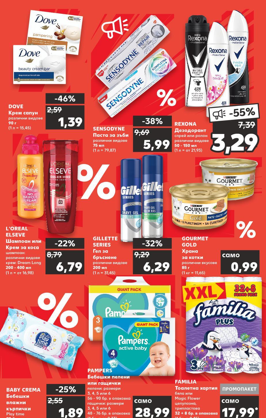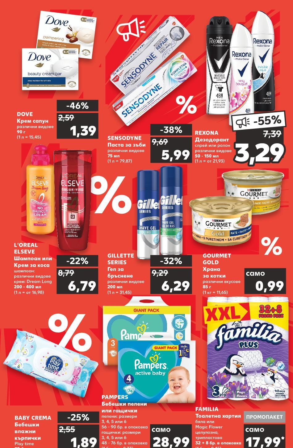 *Със звездичка са обозначени артикулите, които са специално предложение до изчерпване на наличностите. Kaufland не носи отговорност за печатни грешки. BABY CREMA Бебешки влажни кърпички Play time 72 бр. в опаковка -38% 5,99 9,69 -46% 1,39 2,59 0,99 само 17,99* само -25% 1,89 2,55 28,99 само -32% 6,29 9,29 -22% 6,79 8,79 -55% 3,29 7,39SENSODYNE Паста за зъби различни видове 75 мл (1 л = 79,87) DOVE Крем сапун различни видове 90 г (1 л = 15,45) GOURMET GOLD Храна за котки различни вкусове 85 г (1 кг = 11,65) FAMILIA Тоалетна хартия бяла или Magic Flower целулозна, трипластова 32 + 8 бр. в опаковка (1 бр. = 0,45) L‘OREAL ELSEVE Шампоан или Крем за коса шампоан: различни видове крем: Dream Long 200 - 400 мл (1 л = от 16,98) GILLETTE SERIES Гел за бръснене различни видове 200 мл (1 л = 31,45) PAMPERS Бебешки пелени или гащички пелени: размери 3, 4, 5 или 6 56 - 90 бр. в опаковка гащички: размери 3, 4, 5 или 6 48 - 76 бр. в опаковка (1 бр. = от 0,33) REXONA Дезодорант спрей или ролон различни видове 50 - 150 мл (1 л = от 21,93) ПРОМОПАКЕТ S5-BG-KW39-LFT-TOP2_R-1000-10 5