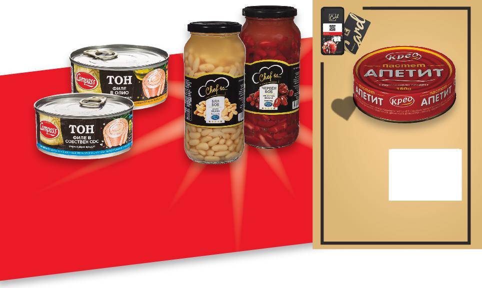 Отстъпката с Kaufland Card e изчислена спрямо стандартната текуща цена, на която продуктът се предлага в хипермаркета. *Със звездичка са обозначени артикулите, които са специално предложение до изчерпване на наличностите. Kaufland не носи отговорност за печатни грешки. -25% ОТСТЪПКА ЗА ВСИЧКИ ПРОДУКТИ С МАРКА MAGGI -33% 4,99 7,55 1,49 само 2,09 само 3,29 само -23% 1,99 2,59 -26% 0,99 1,35 -16% 7,49 8,99 -48% 1,19 2,29само само ОСНОВНИ ХРАНИ И КОНСЕРВИ COMPASS Риба тон филе в собствен сос или в олио 160 г (1 кг = 20,57) CHEF IS... Червен боб, Бял боб, Нахут, Леща или Бял боб със зеленчуци 540 г (1 кг = 3,88) ТРАКИ Едросмляна лютеница традиционна или класик 550 г (1 кг = 9,08) CAMPESE Макаронени изделия различни видове 400 - 500 г (1 кг = до 3,73) ЖИРНОВЪ Панска майонеза 60% 330 г (1 кг = 6,04) VITALIS Овесена закуска различни видове 50 - 60 г (1 кг = до 19,80) TORFELLINI Какаов крем класик, тъмен, с бадем или с лешник 250 г (1 кг = 29,96) КРЕО Пастет апетит 180 г (1 кг = 6,62) Цена с KAUFLAND CARD S25-BG-KW39-LFT-NMP1_R-1000-10 25