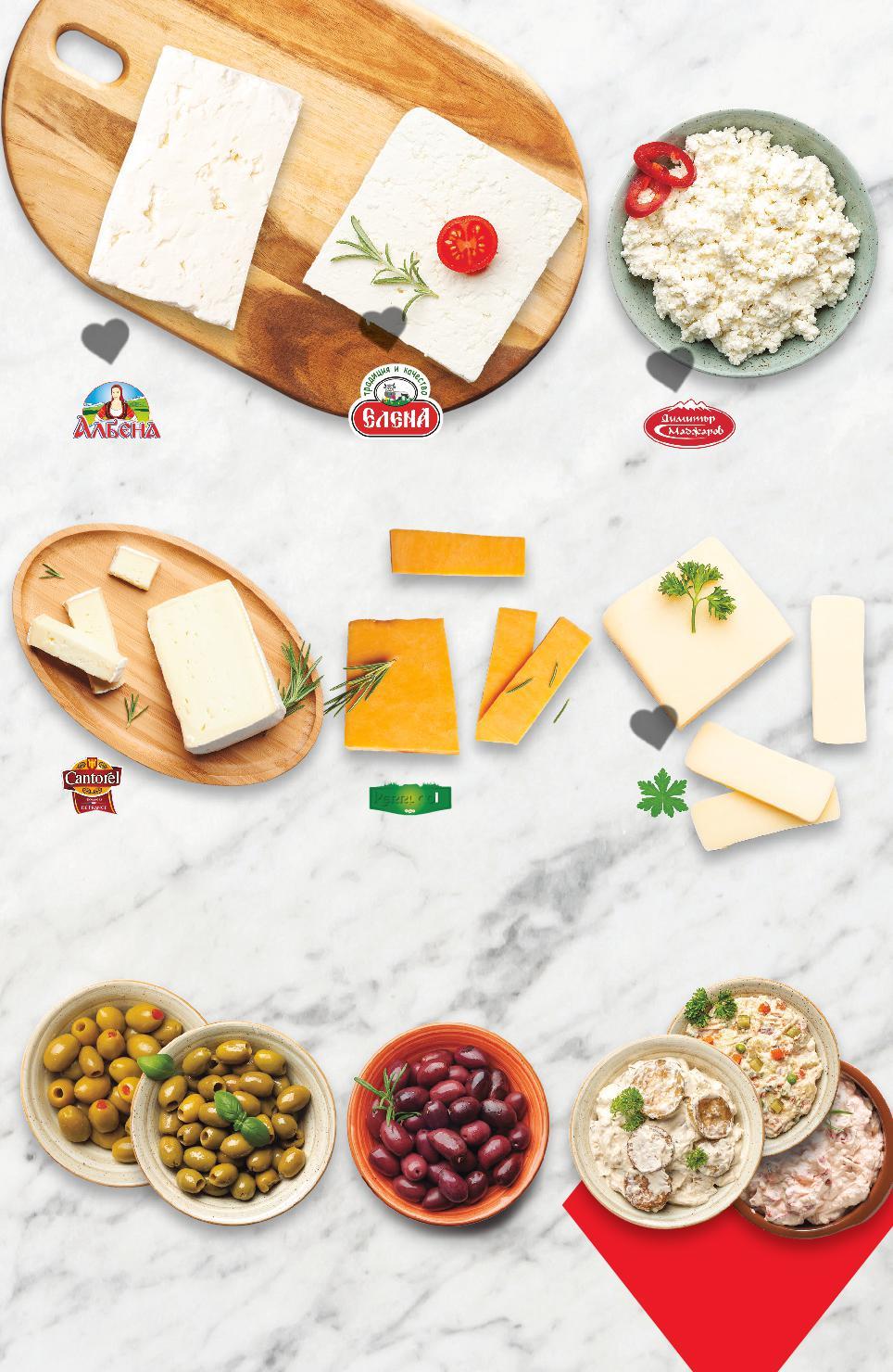 *Със звездичка са обозначени артикулите, които са специално предложение до изчерпване на наличностите. Kaufland не носи отговорност за печатни грешки. -35% ОТСТЪПКА ЗА ИЗБРАНИ САЛАТИ ОТ ВИТРИНА С ОБСЛУЖВАНЕ С ИЗКЛЮЧЕНИЕ НА РИБНИ САЛАТИ 10,69* само 9,49 само 7,99 само -25% 17,99 23,99 -26% 21,99 29,99 -46% 22,99 42,99 4,89* само -30% 14,79 21,25Сирене от краве мляко кг (1 кг = 10,69) Маслини Каламата екстра размер: 121/ 160 Произход: Гърция кг (1 кг = 9,49) Зелени маслини без костилка или Маслини Гръцка салата Произход: Гърция кг (1 кг = 7,99) Кашкавал от краве мляко кг (1 кг = 17,99) Чедър червен Произход: Ирландия кг (1 кг = 21,99) Меко сирене 60% масленост Произход: Франция кг (1 кг = 22,99) Извара кг (1 кг = 4,89) Сирене от овче мляко кг (1 кг = 14,79) СИРЕНЕ И КАШКАВАЛ ОТ ВИТРИНА С ОБСЛУЖВАНЕ ДЕЛИКАТЕСИ ОТ ВИТРИНА С ОБСЛУЖВАНЕ S13-BG-KW39-LFT-BED1_R-1000-10 13
