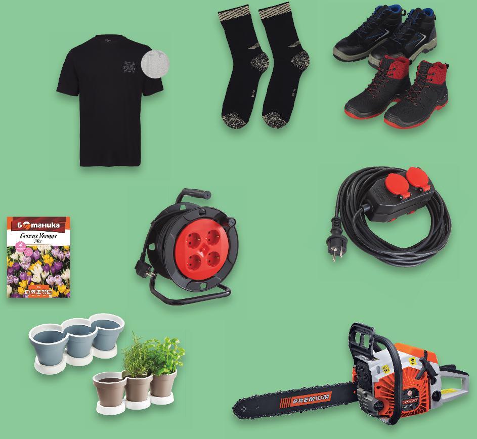 Цените са валидни за посочените на последна страница хипермаркети. Стоките се продават в количества, обичайни за едно домакинство. Всички цени са в лева с включен ДДС. Всички артикули се предлагат без декорация. Снимките са примерни. Нашите марки ЗА ЛАНДШАФТ АРХИТЕКТИ 2 чифта COUNTRYSIDE Градинска ножица острие от закалена въглеродна стомана с незалепващо покритие COUNTRYSIDE Комплект саксийки с обща подложка за подправки, различни цветове, 40 х 15 х 15 см, 3 бр. в комплект Есенни луковици на пролетни цветя различни видове и брой в опаковка Бензинова резачка резервоар за масло 260 мл, дължина на шината 400 мм Разклонител с две гнезда шуко, кабел 10 м MY PROJECT Макара с кабел шуко, кабел 10 м 1200 W /навита/ и 3500 W /развита/ 4,99 само 4,99* само 2,59 само 149,90 само 29,99* само 29,99* само 17,99 само 4,99* 49,99* само само 9,99* само 49,99 само MY PROJECT Мъжка тениска високо съдържание на памук, M - XL сертификат OEKO-TEX® MY PROJECT Мъжки работни чорапи високо съдържание на памук, 39 - 46, сертификат OEKO-TEX® Мъжки работни обувки или боти 41 - 46 COUNTRYSIDE Телескопична ножица за клони или храсти, острие от карбонова стомана с незалепваща защита при затваряне COUNTRYSIDE Компостер за екологично добиване на хумус, от 100% рециклиран материал, 300 л, 61 x 61 x 83 см ОТ ПОНЕДЕЛНИК, 19.09.2022 S46-BG-KW39-LFT-WEEK_L-1000-10 46