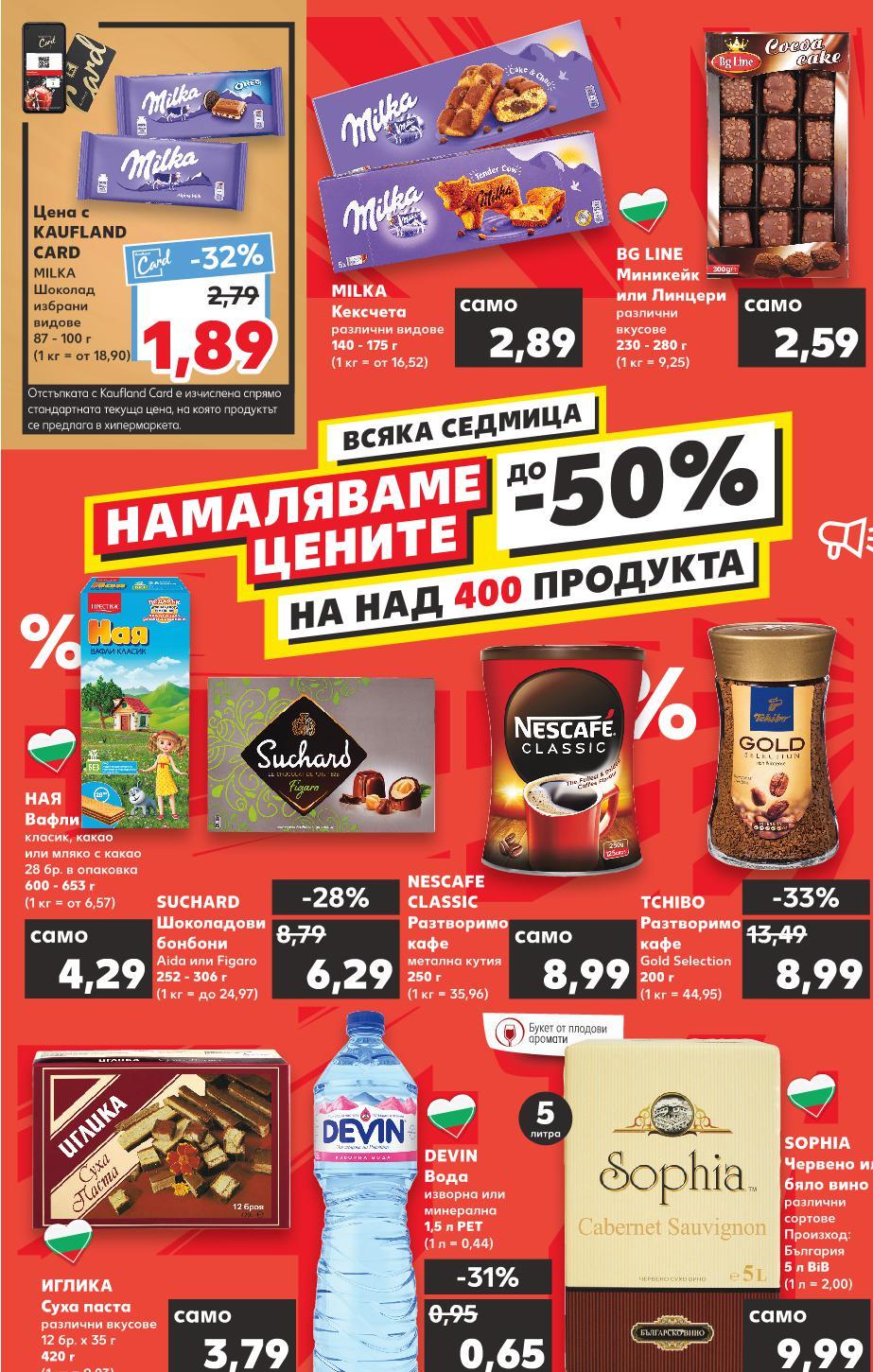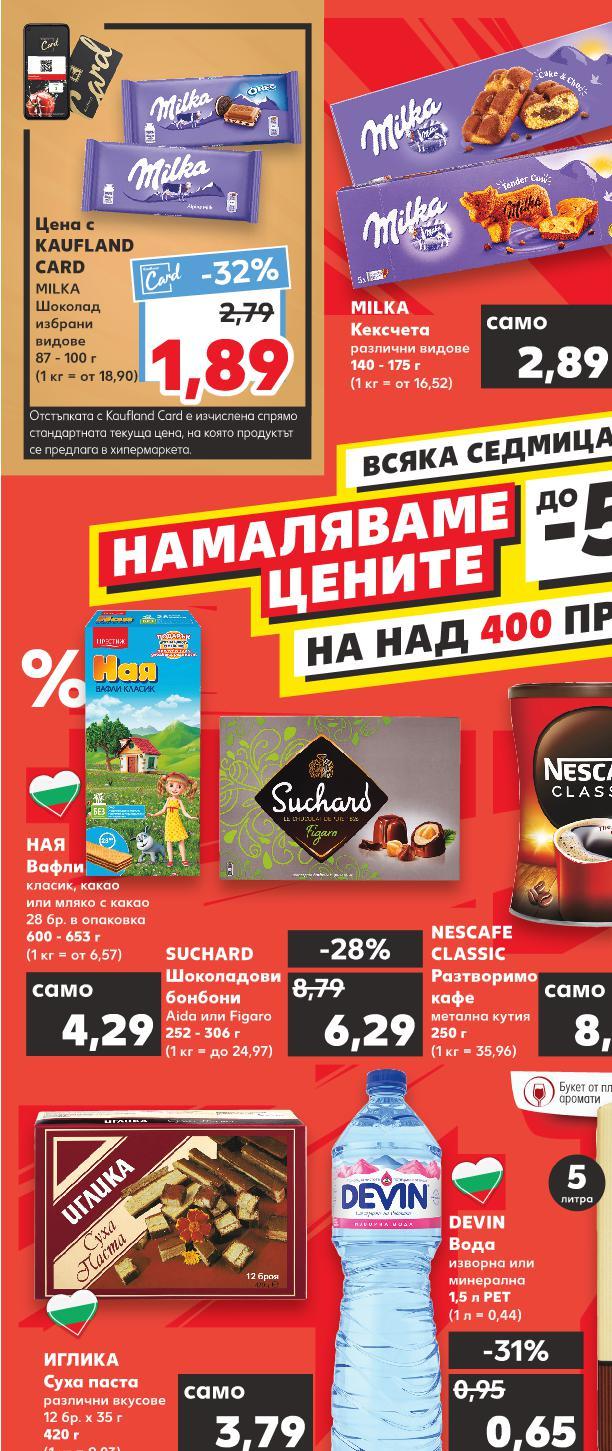 ВСЯКА СЕДМИЦА-50%ДОНАМАЛЯВАМЕ ЦЕНИТЕ НА НАД 400 ПРОДУКТА Отстъпката с Kaufland Card e изчислена спрямо стандартната текуща цена, на която продуктът се предлага в хипермаркета. Цените са валидни за посочените на последна страница хипермаркети Стоките се продават в количества, обичайни за едно домакинство Всички цени са в лева с включен ДДС. Всички артикули се предлагат без декорация. Снимките са примерни. ните Букет от плодови аромати от плодови аромати 2,59 само 3,79 само 8,99 само 4,29 само 9,99 само -31% 0,65 0,95 -33% 8,99 13,49 -28% 6,29 8,79 2,89 само -32% 1,89 с2,79 2,79 амо само MILKA Кексчета различни видове 140 - 175 г (1 кг = от 16,52) SOPHIA Червено или бяло вино различни сортове Произход: България 5 л BiB (1 л = 2,00) НАЯ Вафли класик, какао или мляко с какао 28 бр. в опаковка 600 - 653 г (1 кг = от 6,57) DEVIN Вода изворна или минерална 1,5 л PET (1 л = 0,44) SUCHARD Шоколадови бонбони Aida или Figaro 252 - 306 г (1 кг = до 24,97) TCHIBO Разтворимо кафе Gold Selection 200 г (1 кг = 44,95) NESCAFE CLASSIC Разтворимо кафе метална кутия 250 г (1 кг = 35,96) BG LINE Миникейк или Линцери различни вкусове 230 - 280 г (1 кг = 9,25) ИГЛИКА Суха паста различни вкусове 12 бр. х 35 г 420 г (1 кг = 9,03) MILKA Шоколад избрани видове 87 - 100 г (1 кг = от 18,90) Цена с KAUFLAND CARD 5 литра S4-BG-KW39-LFT-TOP2_L-1000-10 4