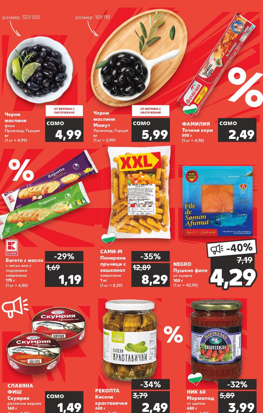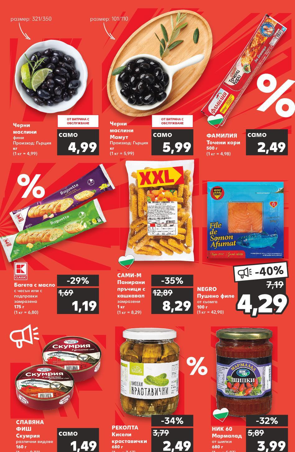 *Със звездичка са обозначени артикулите, които са специално предложение до изчерпване на наличностите. Kaufland не носи отговорност за печатни грешки. 2,49 само 5,99 само 4,99 само -34% 2,49 3,79 1,49 само -35% 8,29 12,89 -29% 1,19 1,69 -32% 3,99 5,89 -40% 7,19 4,29 ФАМИЛИЯ Точени кори 500 г (1 кг = 4,98) Черни маслини Мамут Произход: Гърция кг (1 кг = 5,99) РЕКОЛТА Кисели краставички 680 г (1 кг = 3,67) Черни маслини фини Произход: Гърция кг (1 кг = 4,99) СЛАВЯНА ФИШ Скумрия различни видове 160 г (1 кг = 9,32) NEGRO Пушено филе от сьомга 100 г (1 кг = 42,90) Багета с масло с чесън или с подправки замразена 175 г (1 кг = 6,80) САМИ-М Панирани пръчици с кашкавал замразени 1 кг (1 кг = 8,29) размер: 321/350 размер: 101/110 НИК 60 Мармалад от шипки 680 г (1 кг = 5,87) S3-BG-KW39-LFT-TOP1_R-1000-10 3