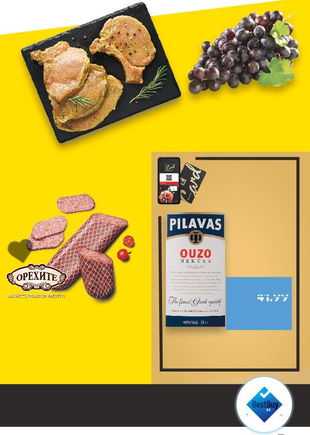 Цените са валидни за посочените на последна страница хипермаркети. Стоките се продават в количества, обичайни за едно домакинство. Всички цени са в лева с включен ДДС. Всички артикули се предлагат без декорация. Снимките са примерни. барбекю: маринован в мед и подправки по селски: във фина билкова марината 9,99 само 10,79 само 7,49* само 9,99 само 8,99 само 5,99 само Гръцки наденички с риган кг (1 кг = 9,99) Пилешко филе от гърди прясно, охладено кг (1 кг = 10,79) Свински ребра за грил кг (1 кг = 7,49) Свински врат без кост барбекю или по селски кг (1 кг = 9,99) Петроханова броеница за скара кг (1 кг = 8,99) Свинска кайма с подправки кг (1 кг = 5,99) МЕСО ОТ ВИТРИНА С ОБСЛУЖВАНЕ ИЗБЕРИ ПРЯСНО МЕСО С БЕЗКОМПРОМИСНО КАЧЕСТВО ПРЕСНИ ДОСТАВКИ ДЕН СЛЕД ДЕН ПРОВЕРЕНО В МЕЖДУНАРОДНА ЛИЦЕНЗИРАНА ЛАБОРАТОРИЯ S12-BG-KW39-LFT-BED1_L-1000-10 12