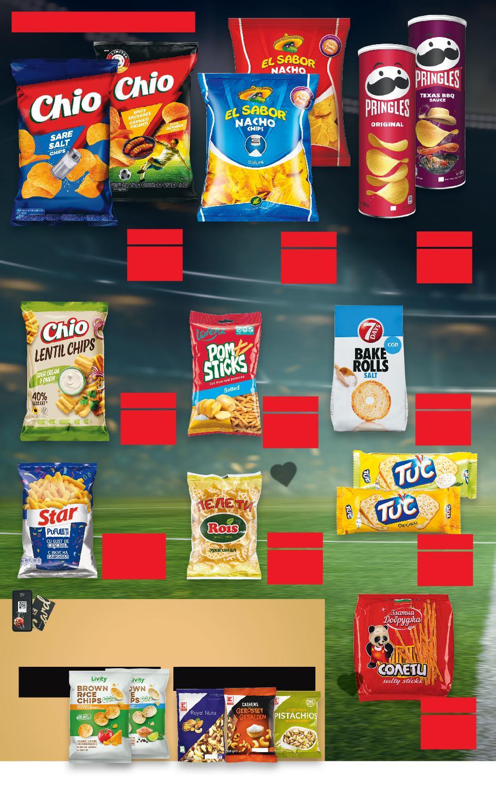 Цените са валидни за посочените на последна страница хипермаркети Стоките се продават в количества, обичайни за едно домакинство Всички цени са в лева с включен ДДС. Всички артикули се предлагат без декорация. Снимките са примерни. - 0% 20% ОТСТЪПКА С KAUFLAND CARDОТСТЪПКА С KAUFLAND CARD ЗА ВСИЧКИ ПРОДУКТИ LIVITY ЗА ВСИЧКИ ПЕЧЕНИ И СУРОВИ ЯДКИ K-CLASSIC 30% ните СУРОВИ K-CLASSIC за кратко при нас -32% 2,89 4,29 -29% 1,59 2,25 -38% 0,89 1,45 -40% 0,99 1,65 -29% 1,89 2,69 1,99* -24% 3,19 4,25 -33% 3,99 5,99 -26% 1,09 1,49 1,99 -40% 1,19 CHIO Чипс различни вкусове 125 - 140 г (1 кг = от 20,65) ЗЛАТНА ДОБРУДЖА Солети 250 г (1 кг = 3,56) ROIS Пелети 60 г (1 кг = 16,50) POMSTICKS Картофени пръчици различни вкусове 85 г (1 кг = 22,24) CHIO Чипс от леща различни вкусове 65 г (1 кг = 30,62) TUC Крекери различни вкусове 100 г (1 кг = 15,90) PRINGLES Чипс различни вкусове 165 г (1 кг = 24,19)