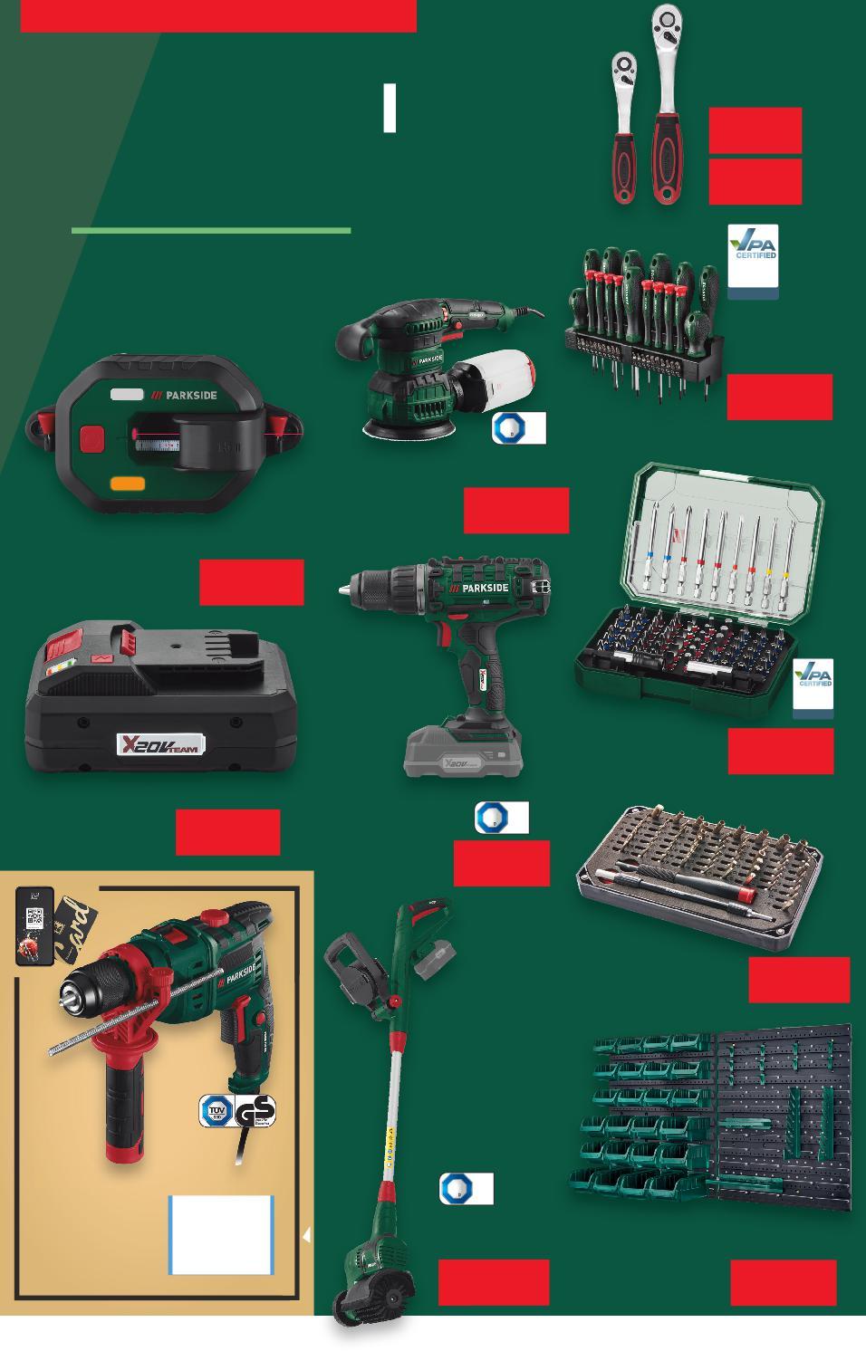 Цените са валидни за посочените на последн ица хипермаркети Стоките се продават в количества, обичайни за едно домакинство Всички цени са в лева с включен ДДС. Всички артикули се предлагат без декорация. Снимките са примерни. ните Всички цени са в лева с включен ДДС Всички артикули се предлагат без декорация Снимките са примерни 2 броя 37 части 43 части 66 части 19,99* 46,99* 39,99* 24,99* 14,99 69,99* 139,90 69,99 24,99* 79,99* -38% 39,99 64,99 22,99 -34% PARKSIDE® Ударна бормашина въртящ момент до 10 Nm, 750 W Цена с KAUFLAND CARD PARKSIDE® Акумулаторна бормашина вкл. LED лампа, без батерия и зарядно PARKSIDE® Комплект битове различни видове и размери PARKSIDE® Тресчотка PARKSIDE® PERFORMANCE Акумулаторна батерия Smart с Bluetooth®, 20 V/4 Ah PARKSIDE® Комплект прецизни инструменти PARKSIDE® Комплект за сортиране 2 x 54 x 45 x 1,8 см, до 32 кг, PARKSIDE® Лазерен нивелир с ролетка PARKSIDE® Комплект отвертки PARKSIDE® Акумулаторна четка за външни настилки без батерия и зарядно PARKSIDE® Ексцентършлайф обороти на празен ход: 8000 - 24000 мин-1, 480 W ОТ ПОНЕДЕЛНИК, 10.06. 3 ГОДИНИ ГАРАНЦИЯ 3 ГОДИНИ ГАРАНЦИЯ 5 ГОДИНИ ГАРАНЦИЯ** 3 ГОДИНИ ГАРАНЦИЯ 3 ГОДИНИ ГАРАНЦИЯ S62-BG-KW24-LFT-NF_1_1_L-6400-10 62