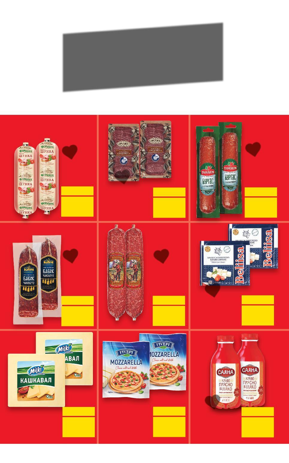 Цените са валидни за посочените на последна страница хипермаркети. Стоките се продават в количества, обичайни за едно домакинство. Всички цени са в лева с включен ДДС. Всички артикули се предлагат без декорация. Снимките са примерни. -50% -50% -50% -50% -50% -50% -50% -50% -50% 10,78 16,58 19,98 18,98 21,98 20,98 11,98 17,98 3,38 10,99 10,49 5,39* 5,99 8,99 8,29 9,99 9,49 1,69 САЯНА Прясно мляко 3% масленост 2 x 500 мл (1 л = 1,69) ФЕРМАТА Шунка 2 x 450 г (1 кг = 5,99) MILKI DREAM Кашкавал от краве мляко 2 х 400 г (1 кг = 12,49) БЕЛИИСА Сирене от краве мляко 2 х 400 г (1 кг = 11,87) Стария ловец Луканка Трапезица 2 х 320 г (1 кг = 17,18) КФМ Бабек Чановете 2 x 170 г (1 кг = 30,86) FIVEPI Моцарела твърда 2 х 350 г (1 кг = 11,85) Тандем Шпек Бургас 2 х 210 г (1 кг = 21,41) ОРЕХИТЕ Луканка, Бабек или Салам Амбарица слайс 2 х 80-100 г (1 кг = от 29,95) ВЗ И Е 1+1