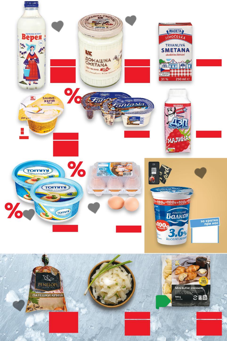 Цените са валидни за посочените на последна страница хипермаркети. Стоките се продават в количества, обичайни за едно домакинство. Всички цени са в лева с включен ДДС. Всички артикули се предлагат без декорация. Снимките са примерни. Всички Kaufland Card отстъпки са изчислени спрямо стандартната текуща цена, на която продуктът се предлага в хипермаркета. *Със звездичка са обозначени артикулите, които са специално предложение до изчерпване на наличностите. Kaufland не носи отговорност за печатни грешки. Ново -23% 3,29 4,29 -24% 4,69 6,19 -21% 2,49 3,19 -33% 6,99 10,49 -27% 6,49 8,99 -28% 1,99 2,79 -22% 2,55 3,29 -25% 1,49 1,99 -15% 1,69 1,99 -15% 1,69 1,99 МЛЕЧНИ, РАСТИТЕЛНИ ПРОДУКТИ И ЯЙЦА -35% 1,29 1,99 3,49 -42% 1,99 PENELOPE Патешки крила замразени кг MADETA Млечна сметана 31% масленост 250 мл (1 л = 13,16) LK Заквасена сметана домашна 20% масленост 500 г (1 кг = 9,38) ВЕРЕЯ Прясно мляко 3% масленост 1 л EESTI PAGAR Миникроасани с масло замразени 600 г (1 кг = 11,65) Говеждо шкембе варено замразено 1 кг TOMMI Продукт за мазане различни видове 500 г (1 кг = 3,98) ХОРИЗОНТ Яйца от клетъчно отглеждани кокошки размер М 6 бр. (1 бр. = 0,43) Крем кефир различни видове 250 г (1 кг = 5,96) DANONE Напитка ДЗП различни вкусове 310 г (1 кг = 5,46)