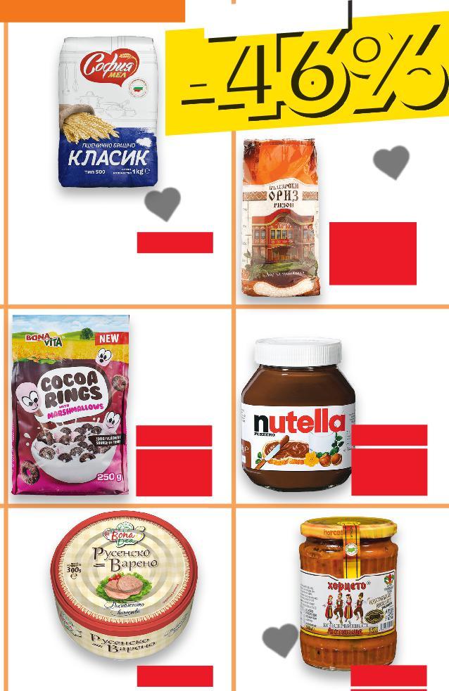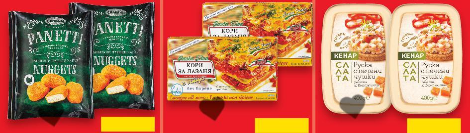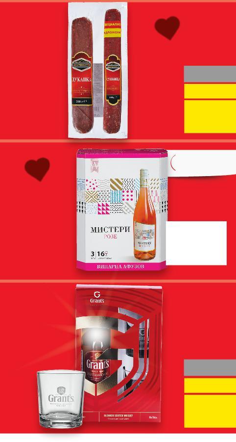 Цените са валидни за посочените на последна страница хипермаркети. Стоките се продават в количества, обичайни за едно домакинство. Всички цени са в лева с включен ДДС. Всички артикули се предлагат без декорация. Снимките са примерни. -50% -50% -50% -50% -50% -50% -50% -50% -50% -50% 10,78 16,58 19,98 18,98 21,98 22,58 20,98 11,98 17,98 3,38 10,99 11,29 10,49 5,39* 5,99 8,99 8,29 9,99 9,49 1,69 САЯНА Прясно мляко 3% масленост 2 x 500 мл (1 л = 1,69) ФЕРМАТА Шунка 2 x 450 г (1 кг = 5,99) MILKI DREAM Кашкавал от краве мляко 2 х 400 г (1 кг = 12,49) БЕЛИИСА Сирене от краве мляко 2 х 400 г (1 кг = 11,87) Стария ловец Луканка Трапезица 2 х 320 г (1 кг = 17,18) СТАРИЯ ЛОВЕЦ Ловджийски деликатес 2 х 400 г (1 кг = 14,12) КФМ Бабек Чановете 2 x 170 г (1 кг = 30,86) FIVEPI Моцарела твърда 2 х 350 г (1 кг = 11,85) Тандем Шпек Бургас 2 х 210 г (1 кг = 21,41) ОРЕХИТЕ Луканка, Бабек или Салам Амбарица слайс 2 х 80-100 г (1 кг = от 29,95) ВЗ И Е 1+1