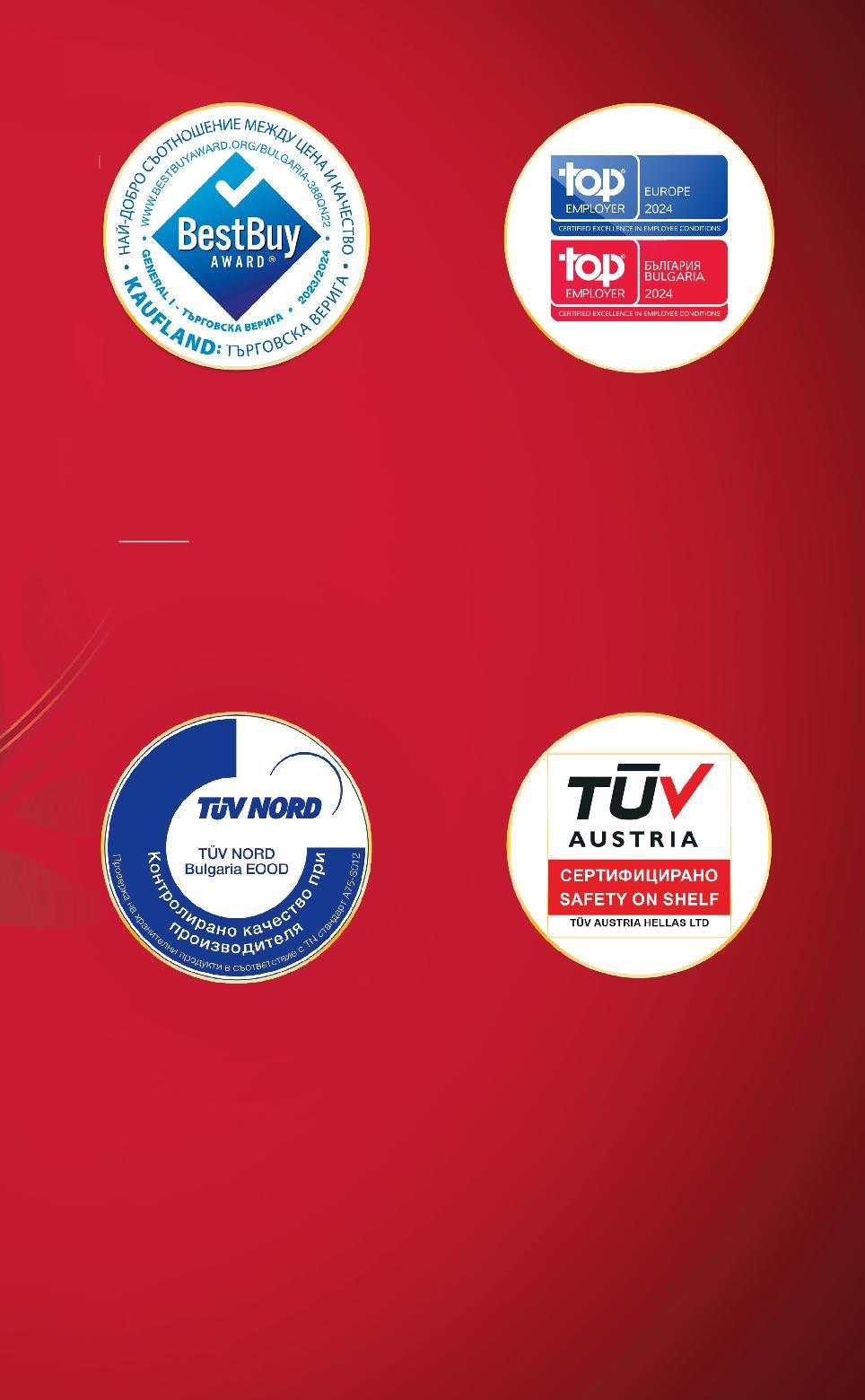 ТЪРГОВСКА ВЕРИГА, ПРЕДЛАГАЩА НАЙ-ДОБРО СЪОТНОШЕНИЕ МЕЖДУ ЦЕНА И КАЧЕСТВО ПРОДУКТИ С ПРОВЕРЕНО КАЧЕСТВО НА СВЕТОВНО НИВО* ТOP-EMPLOYERГРИЖА И РАЗВИТИЕ НА СЛУЖИТЕЛИТЕ, ОТЛИЧНИ УСЛОВИЯ НА ТРУД И РАБОТНА СРЕДА 4-СТЕПЕНЕН КОНТРОЛ НА КАЧЕСТВОТО** *Търсете логото на TÜV Nord за сертифицираните продукти. **Сертификатът TÜV Austria важи за мляно месо Шеф Месар и кайма Брей! от витрина с обслужване. S81-BG-KW24-LFT-Online_5Stars_R-1000-10 81